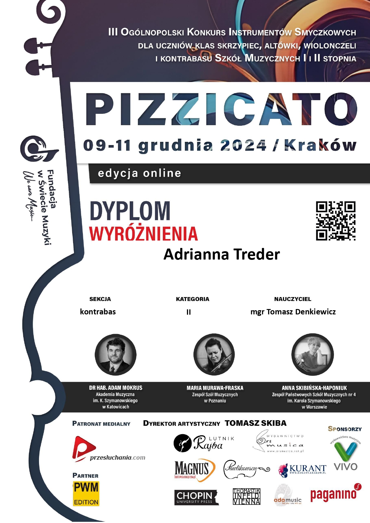 Adrianna Treder z klasy kontrabasu Pana Tomasza Denkiewicza otrzymała wyróżnienie na III Ogólnopolskim Konkursie Instrumentów Smyczkowych "Pizzicato".