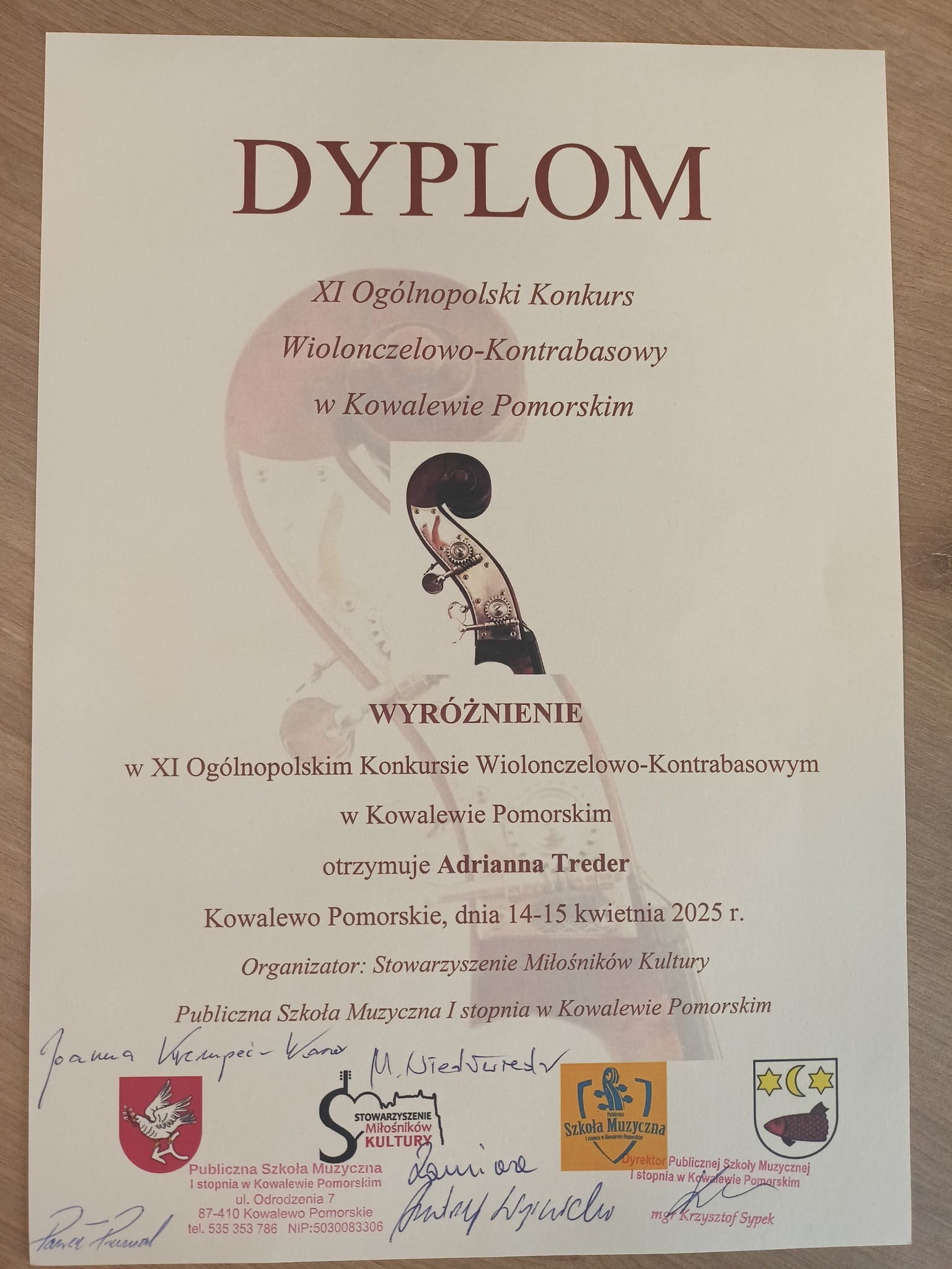 Tego samego dnia Adrianna Treder z klasy kontrabasu p. Tomasza Denkiewicza otrzymała wyróżnienie na XI Ogólnopolskim Konkursie Wiolonczelowo-Kontrabasowym w Kowalewie Pomorskim.