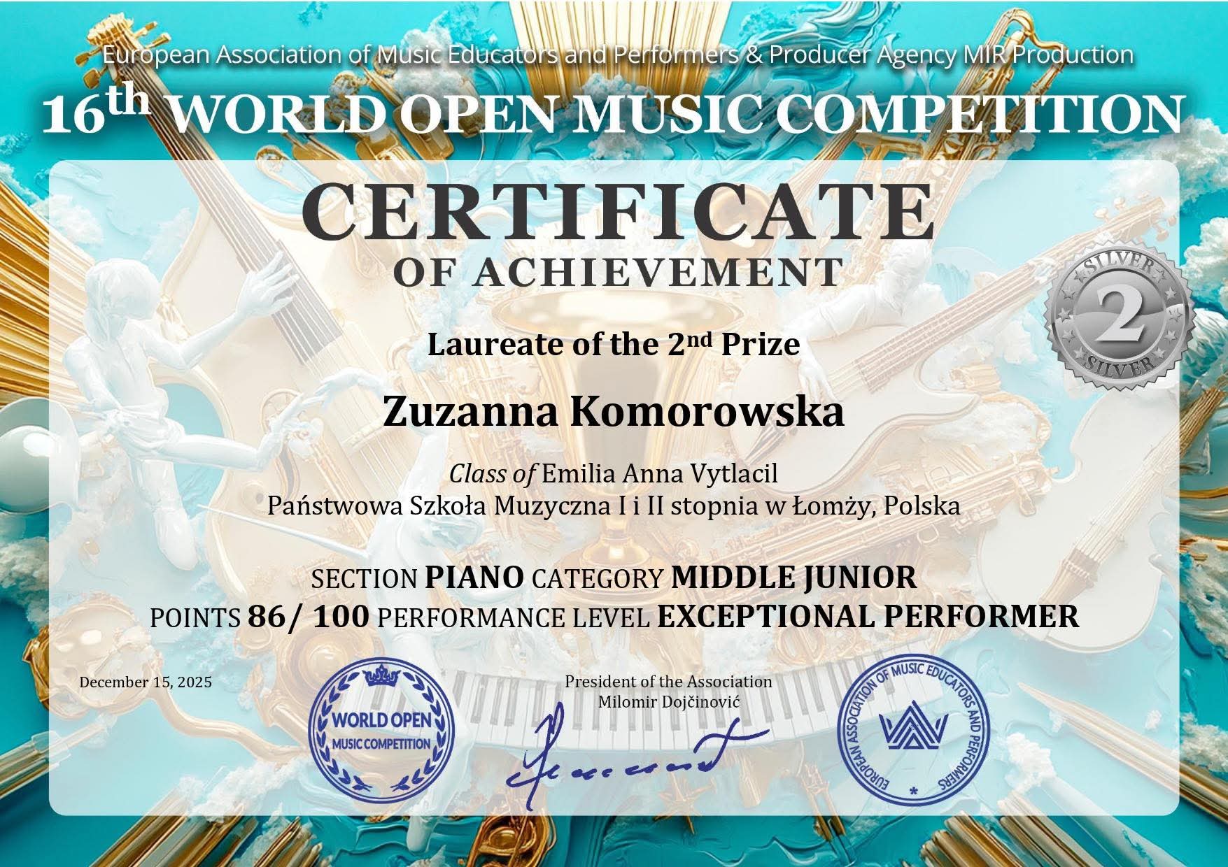 Zuzanna Komorowska (fortepian) przygotowana przez Panią Emilię Vytlacil zdobyła II nagrodę w kategorii middle junior,