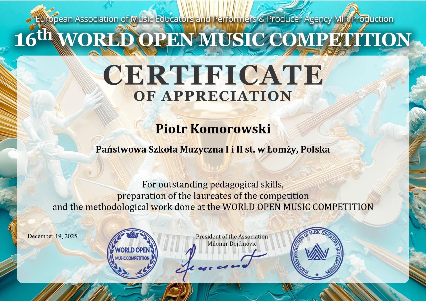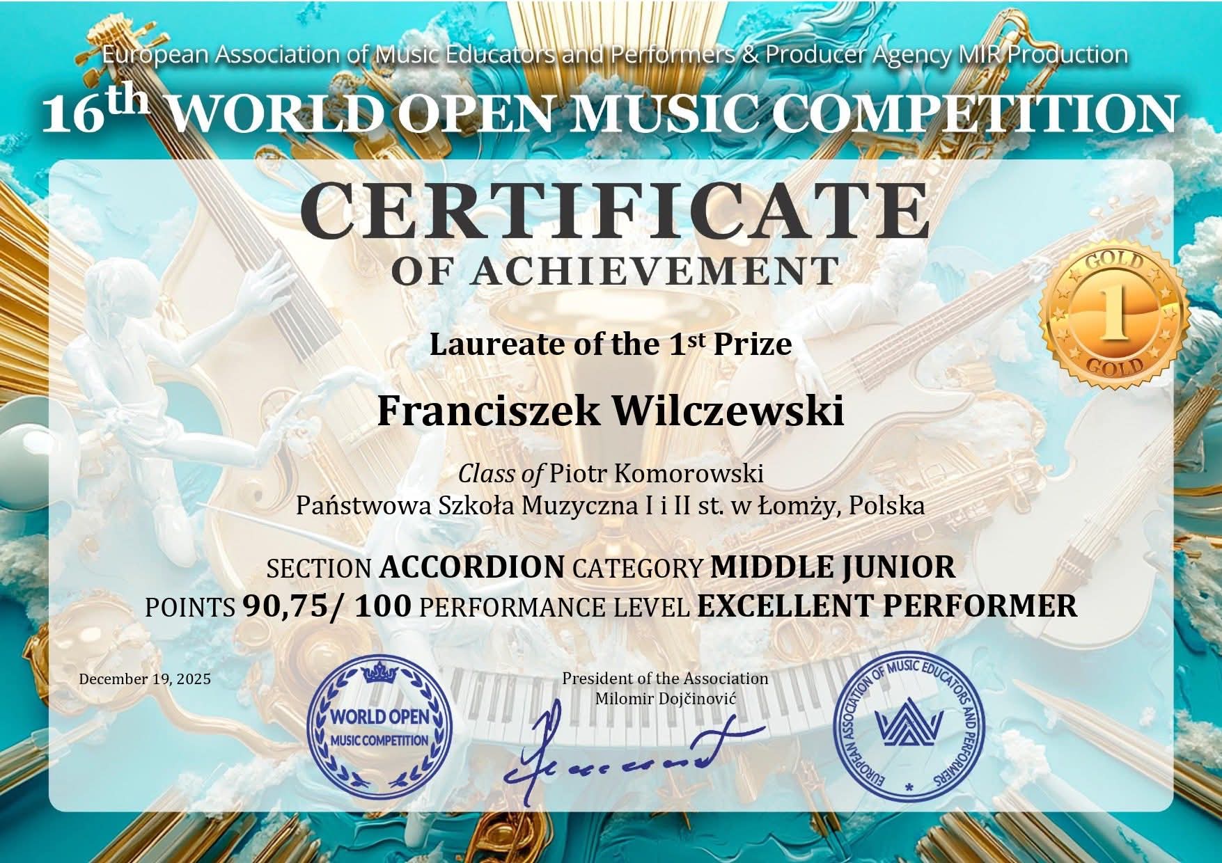 Franciszek Wilczewski (akordeon) przygotowany przez Pana Piotra Komorowskiego zdobył I miejsce w kategorii middle junior.