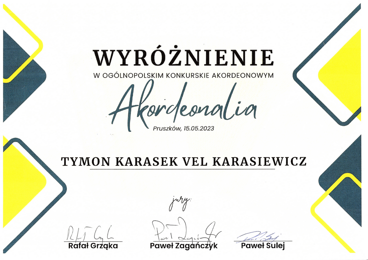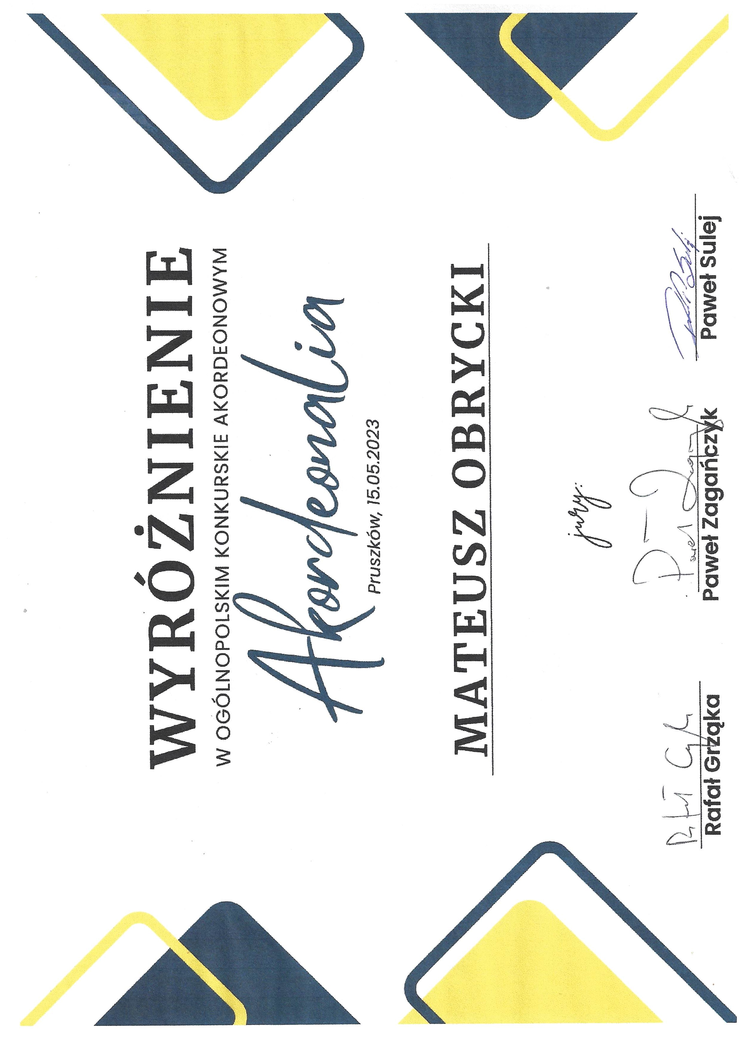 W Ogólnopolskim Konkursie Akordeonowym "Akordeonalia" , który odbył się w Pruszkowie 15 maja 2023 roku, uczniowie: Mateusz Obrycki i Tymon Karasek vel Karasiewicz przygotowani przez Pana Stanisława Morawskiego uzyskali wyróżnienia.