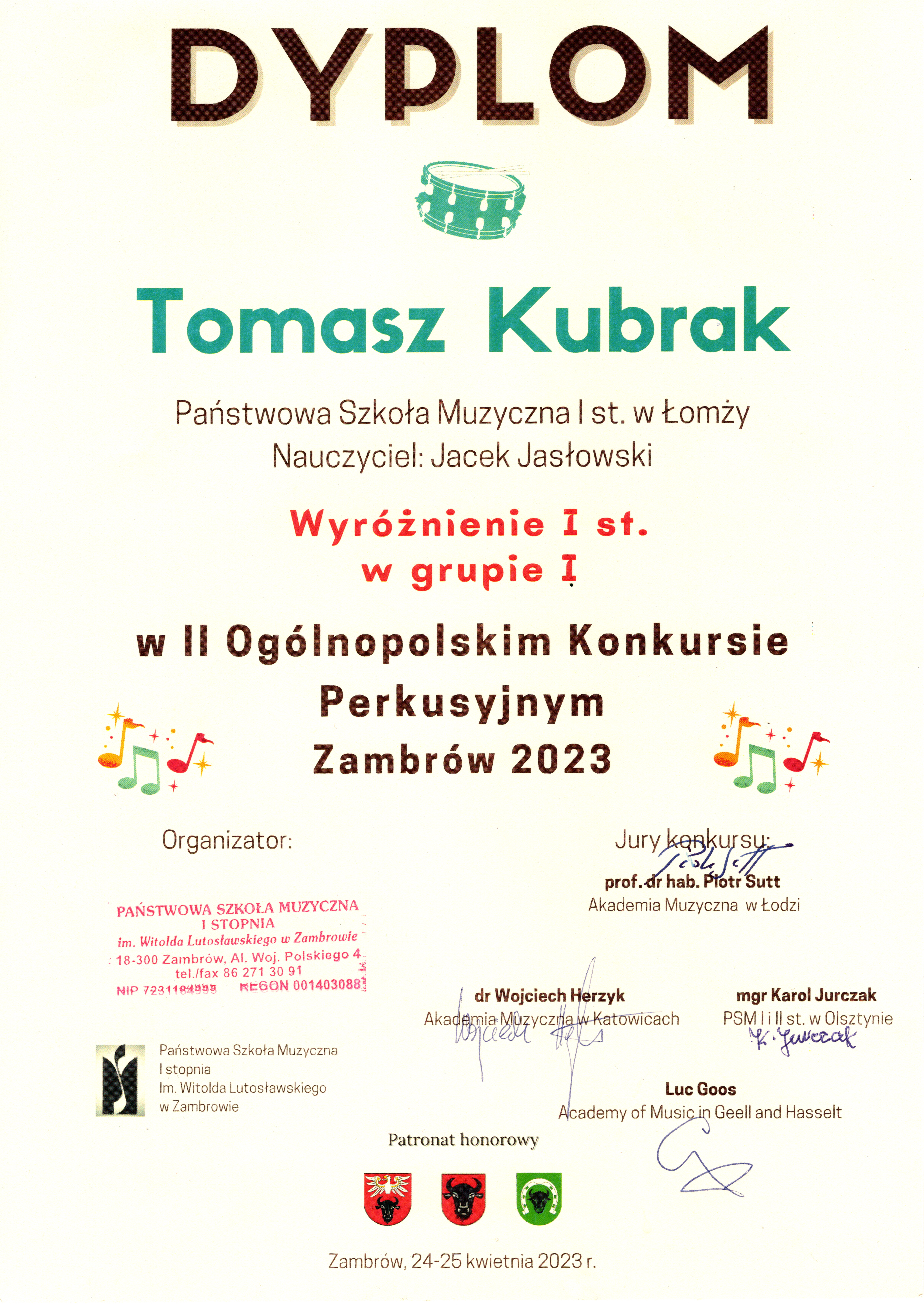 W II Ogólnopolskim Konkursie Perkusyjnym Zambrów 2023 duży sukces odniósł Tomasz Kubrak przygotowany przez Jacka Jasłowskiego. Uzyskał wyróżnienie I stopnia w kategorii I i zdobył nagrodę specjalną za najciekawsze wykonanie "Piosenki o uśmiechniętym kocie".