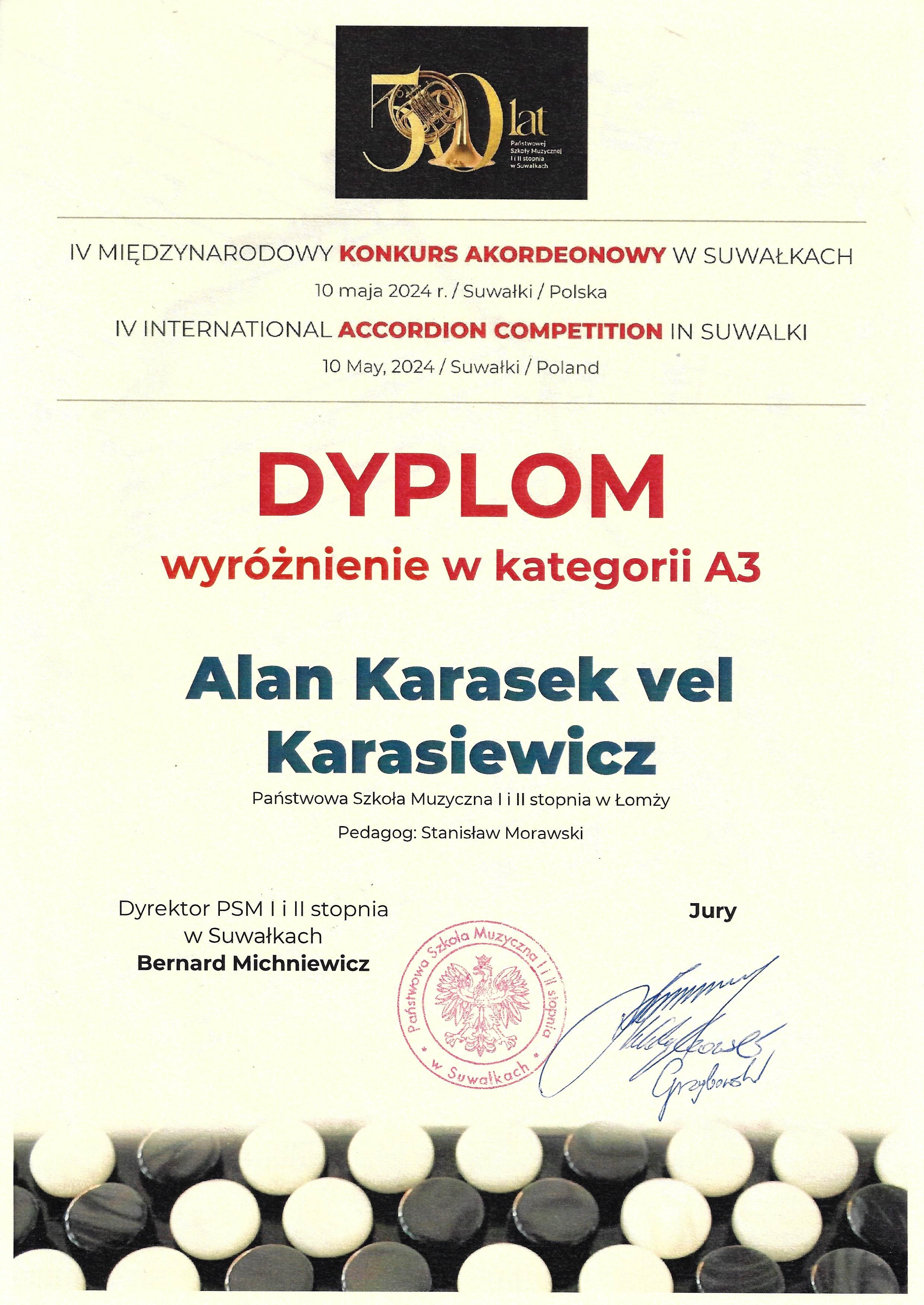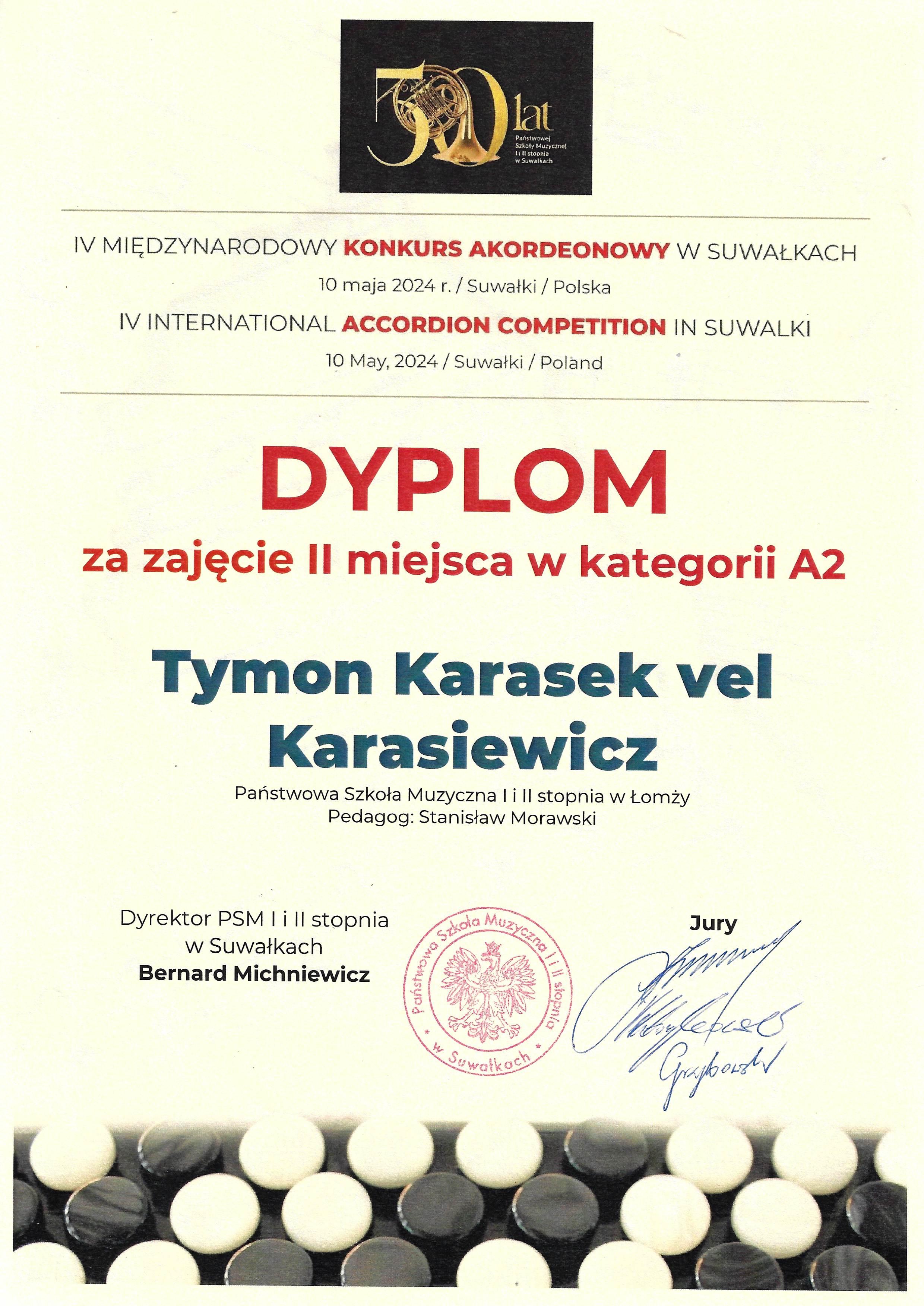 W odbywającym się w Suwałkach IV Międzynarodowym Konkursie Akordeonowym Alan Karasek vel Karasiewicz uzyskał wyróżnienie w kategorii A3, a Tymon Karasek vel Karasiewicz zdobył II miejsce w kategorii A2. Obaj bracia są uczniami Pana Stanisława Morawskiego.