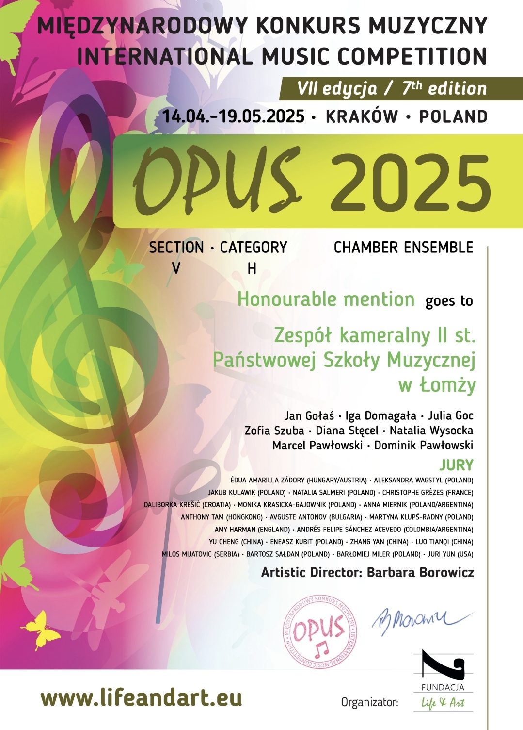 Zespół kameralny PSM II stopnia w Łomży pod kierownictwem Pani Katarzyny Januszkiewicz wziął udział w 7 edycji Międzynarodowego Konkursu Muzycznego "OPUS 2025" w Krakowie.