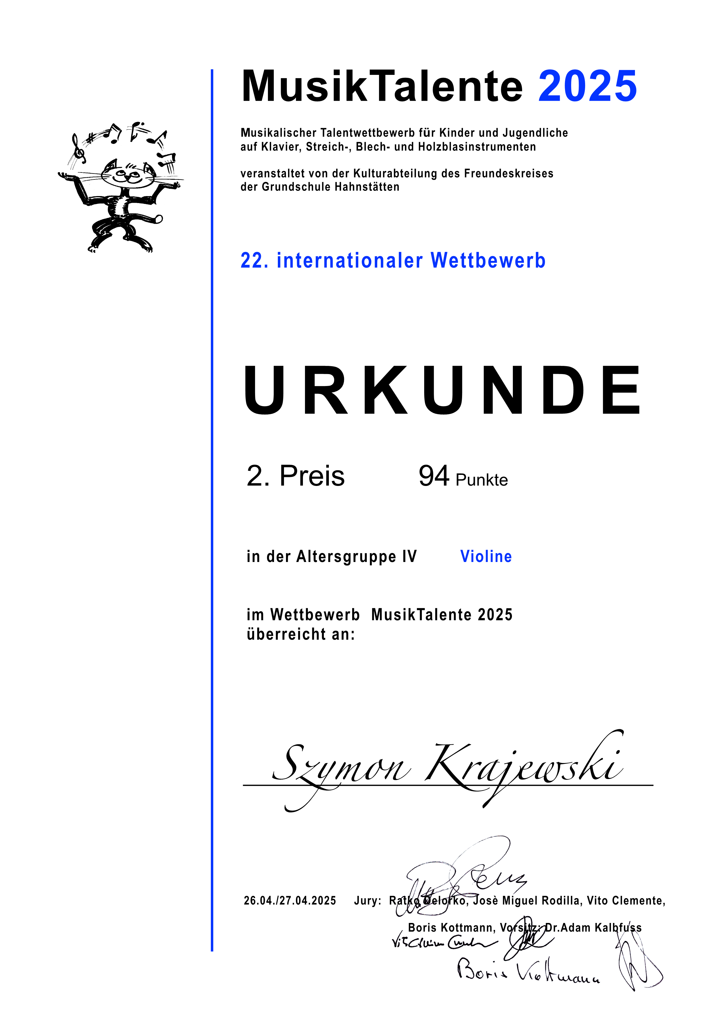 W odbywającym się 26 kwietnia 2025 r. w Niemczech 22 Konkursie "MusikTalente 2025" Szymon Krajewski z klasy Pani Moniki Zarzyckiej uzyskał 2 miejsce w grupie skrzypiec w kategorii IV.