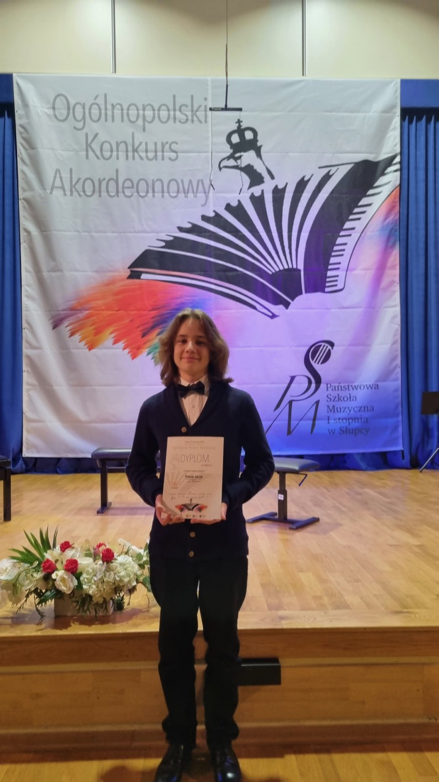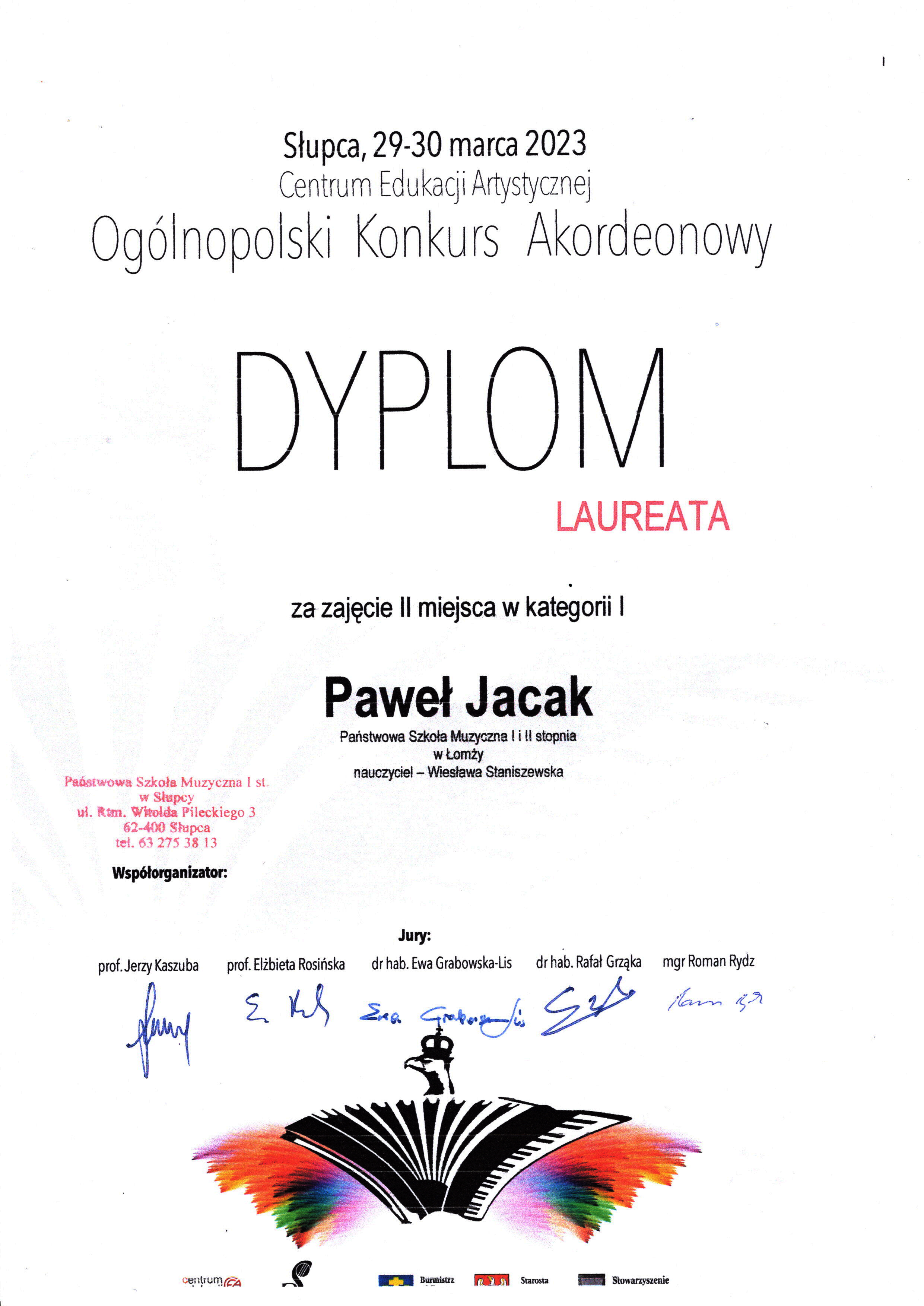W odbywającym się w dniach 29-30 marca 2023 r. w Słupcy Ogólnopolskim Konkursie Akordeonowym dla szkół muzycznych II stopnia Paweł Jacak z klasy mgr Wiesławy Staniszewskiej zdobył II miejsce w kategorii I.