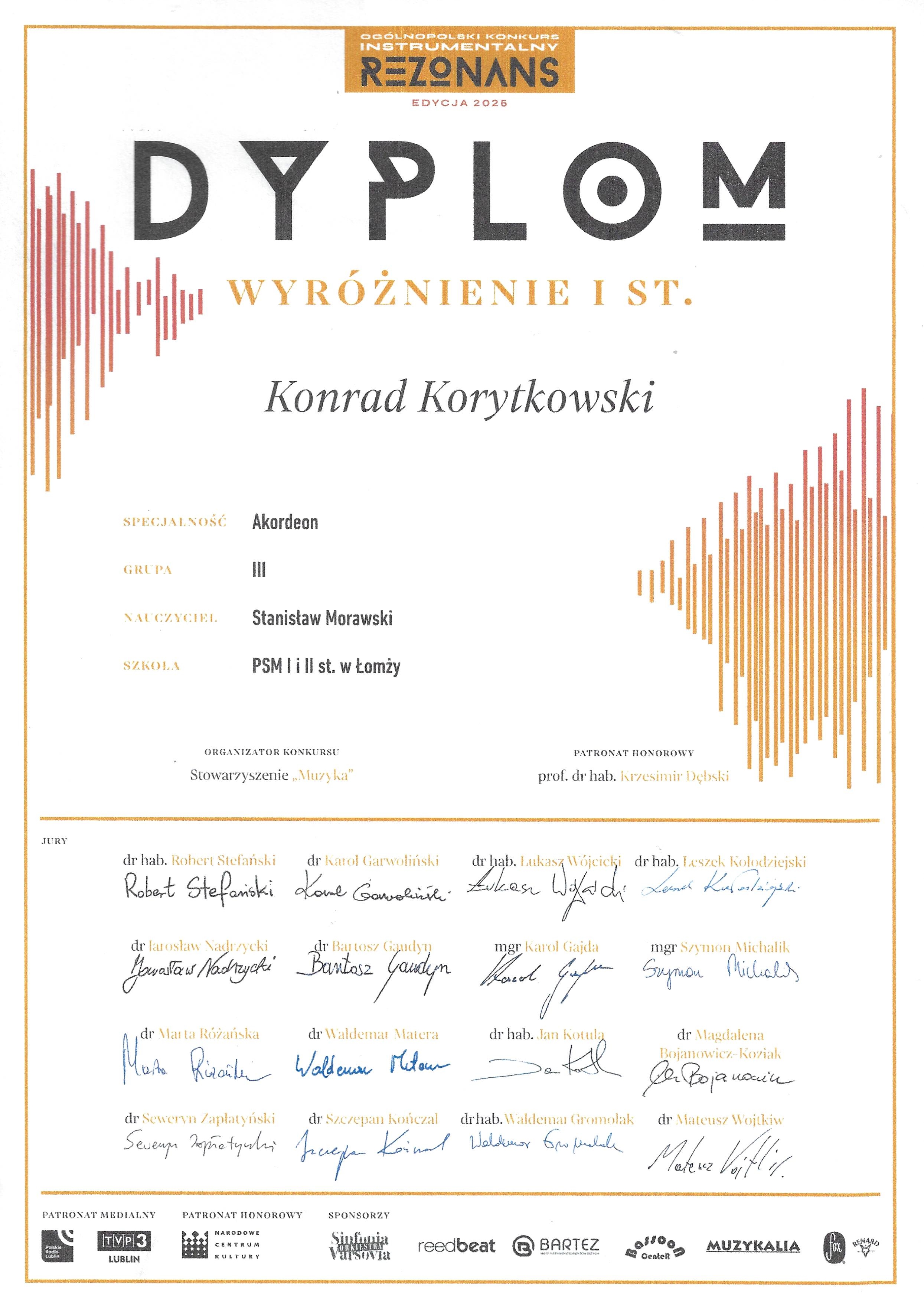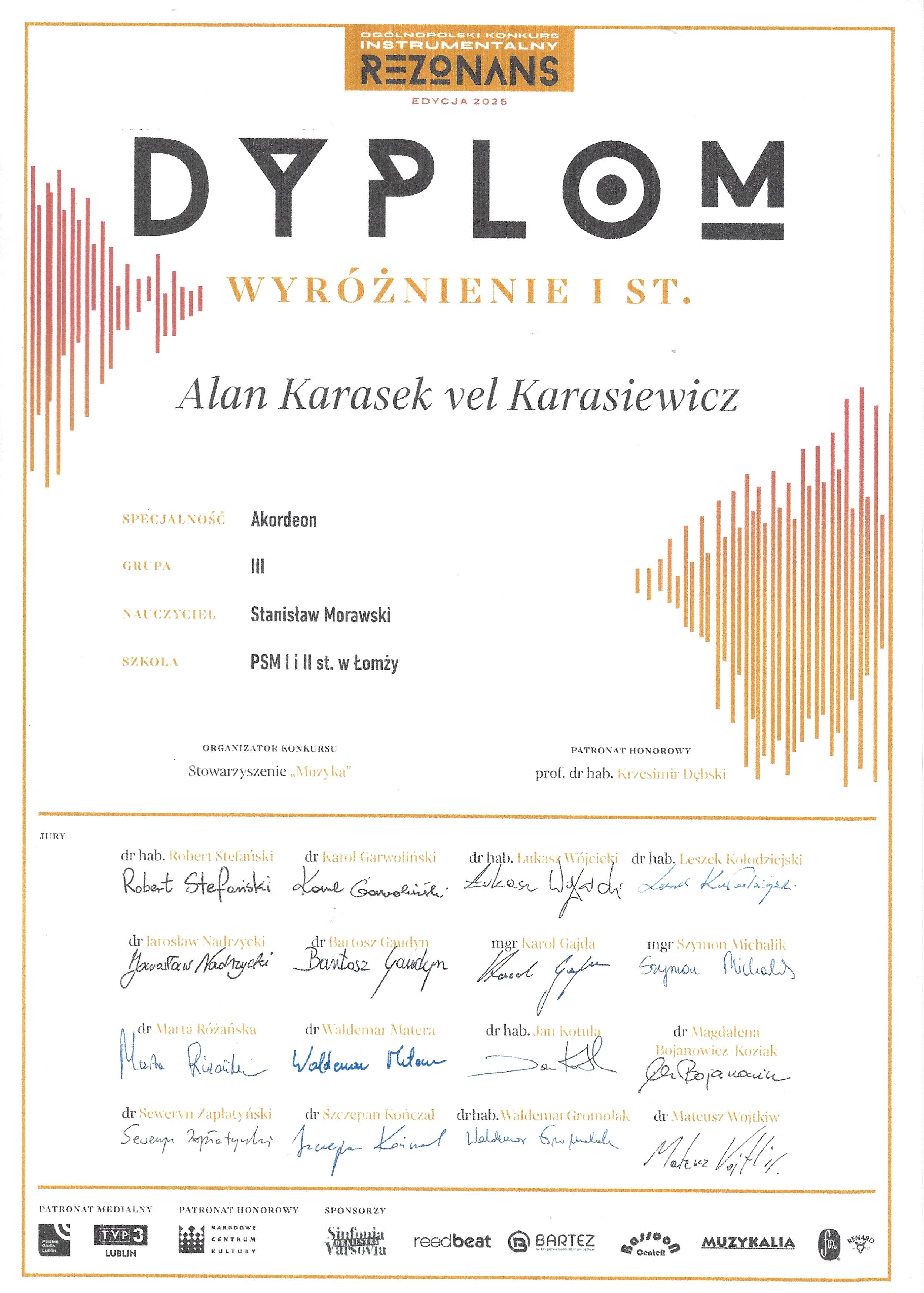 Ogólnopolski Konkurs Instrumentalny REZONANS - wystartowało w nim 3 naszych uczniów - akordeonistów - przygotowanych przez Pana Stanisława Morawskiego. W grupie II wyróżnienie I stopnia zfobył Tymon Karasek vel Karasiewicz. Również wyróżnienia I stopnia, tylko w grupie III zdobyli Alan Karasek vel Karasiewicz i Konrad Korytkowski.