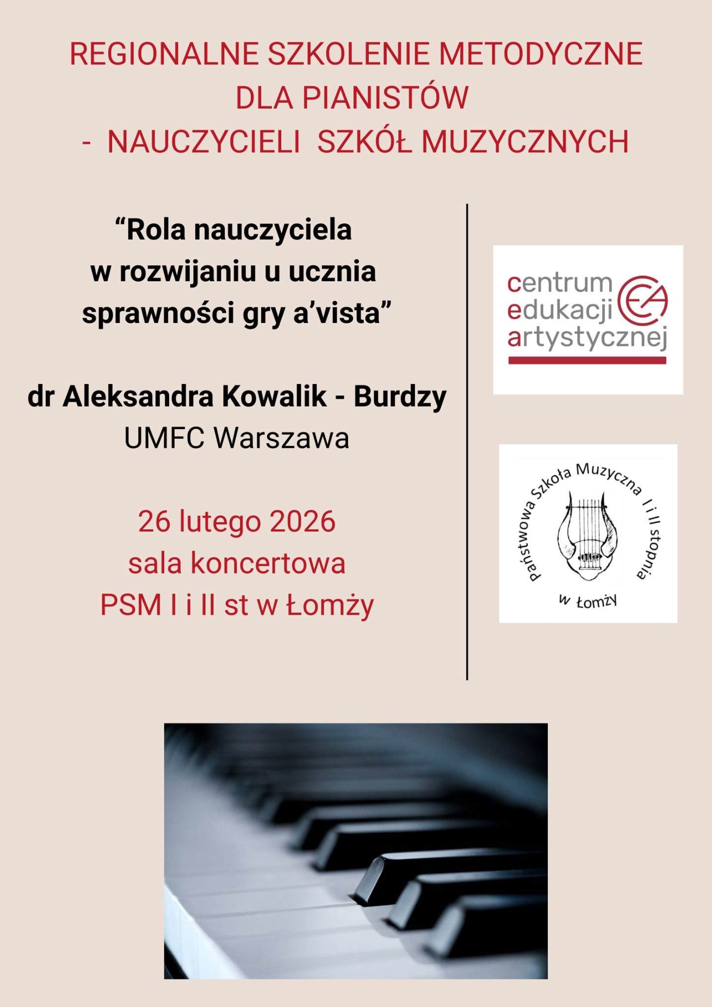26 lutego 2026 odbędzie się w PSM w Łomży szkolenie metodyczne "Rola nauczyciela w rozwijaniu u ucznia sprawności gry a vista", które poprowadzi dr Aleksandra Kowalik-Burdzy. Początek szkolenia o godzinie 10:00.