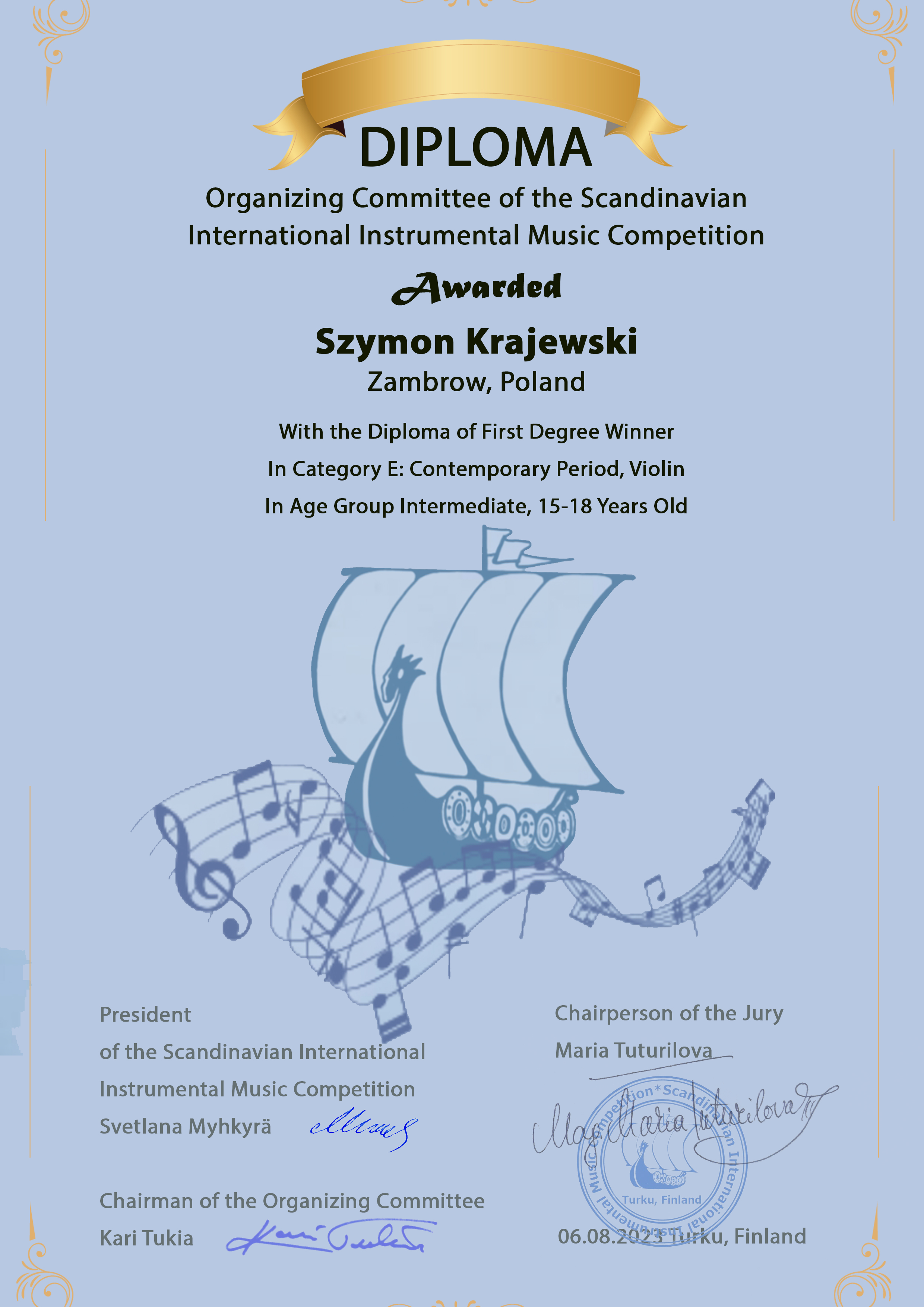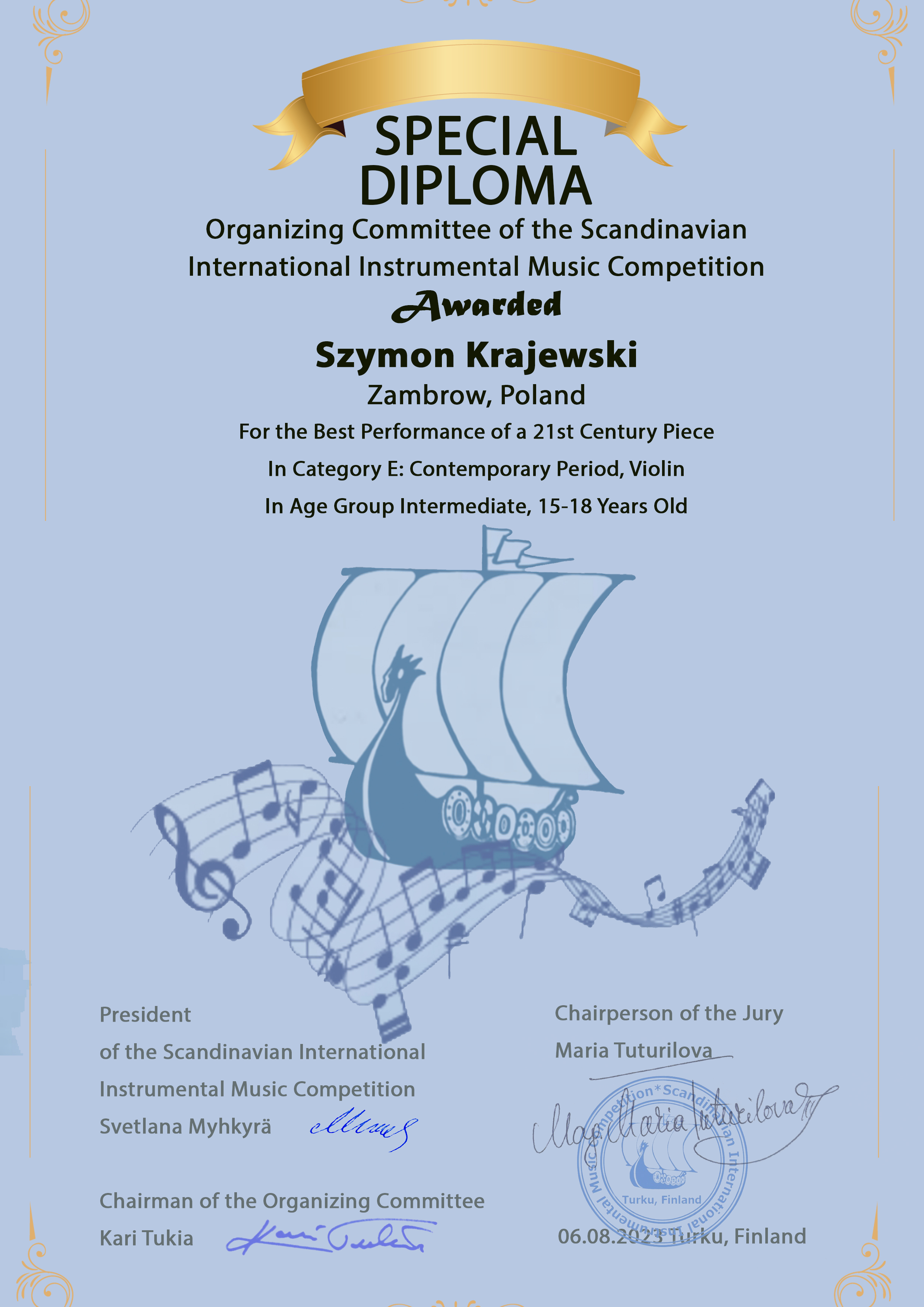 W odbywającym się 06 sierpnia 2023 r. w Turku w Finlandii Skandynawskim Międzynarodowym Konkursie Instrumentalnym uczeń Pani Moniki Zarzyckiej - Szymon Krajewski - zdobył I miejsce w grupie skrzypiec w kategorii E (uczestnicy w wieku 15-18 lat), a dodatkowo zdobył również nagrodę specjalną za najlepsze wykonanie utworu współczesnego (z XXI wieku).
