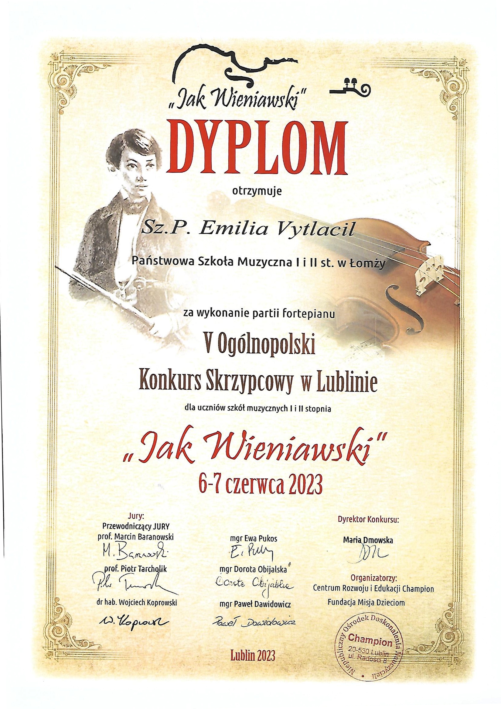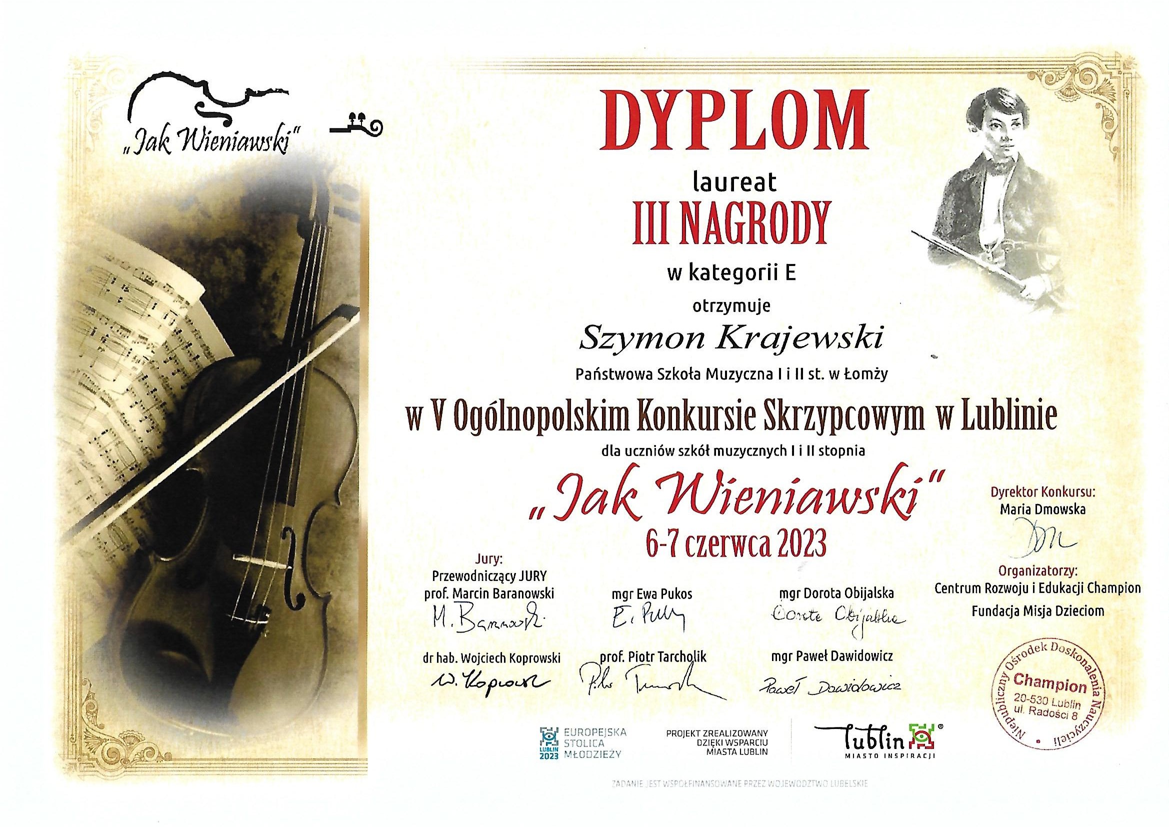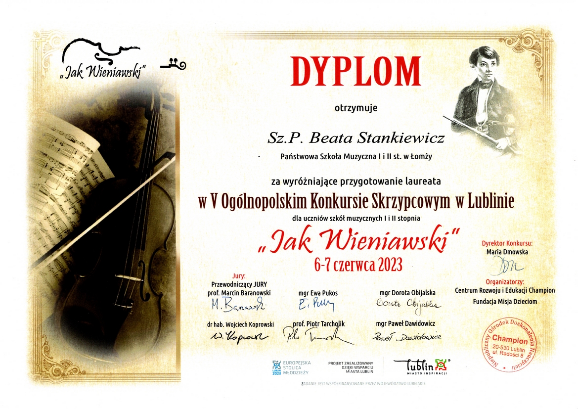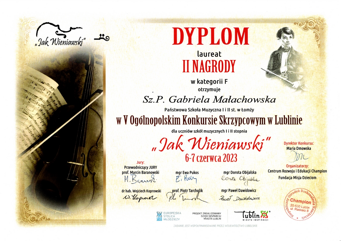 W odbywającym się w Lublinie w dniach 6-7 czerwca 2023 r. V Ogólnopolskim Konkursie Skrzypcowym "Jak Wieniawski" wzięło udział dwóch uczniów naszej szkoły. Szymon Krajewski przygotowany przez Panią Monikę Zarzycką zdobył III miejsce w kategorii E, a w starszej kategorii F II miejsce otrzymała Gabriela Małachowska przygotowana przez Panią Beatę Stankiewicz. Dyplomy za wyróżniające przygotowanie laureatów otrzymały również nauczycielki, a akompaniująca Szymonowi Pani Emilia Vytlacil.