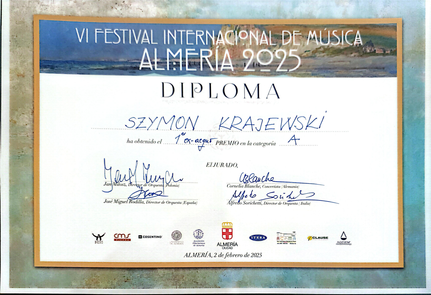 W odbywającym się w Hiszpanii VI Międzynarodowym Festiwalu Muzycznym "Almeria 2025" Szymon Krajewski przygotowany przez Panią Monikę Zarzycką zdobył I miejsce. Nagrodą są koncerty z orkiestrą symfoniczną w Hiszpanii.