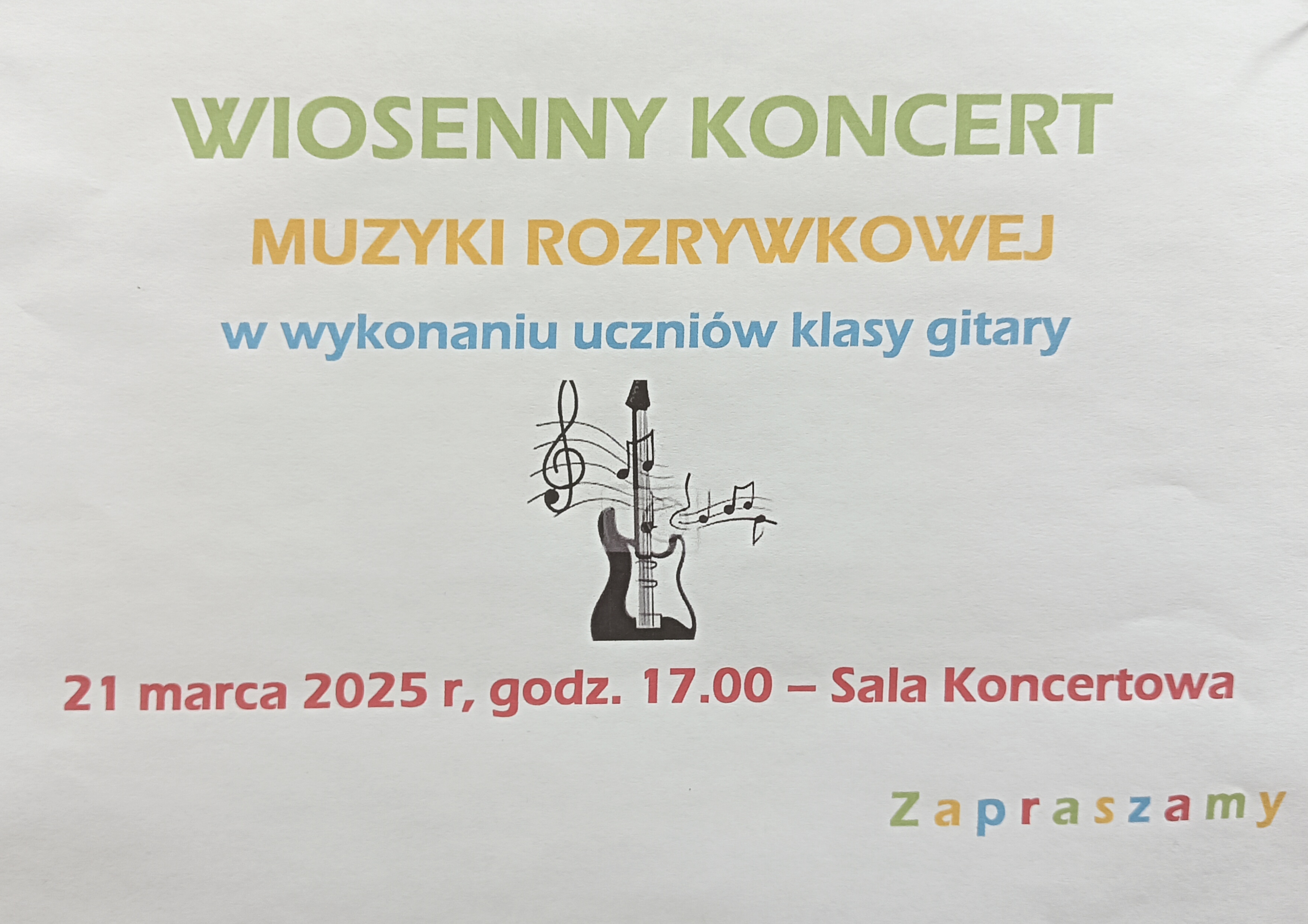 21 marca o godzinie 17:00 w Sali Koncertowej PSM odbędzie się Wiosenny Koncert Muzyki Rozrywkowej w wykonaniu uczniów klasy gitary.
