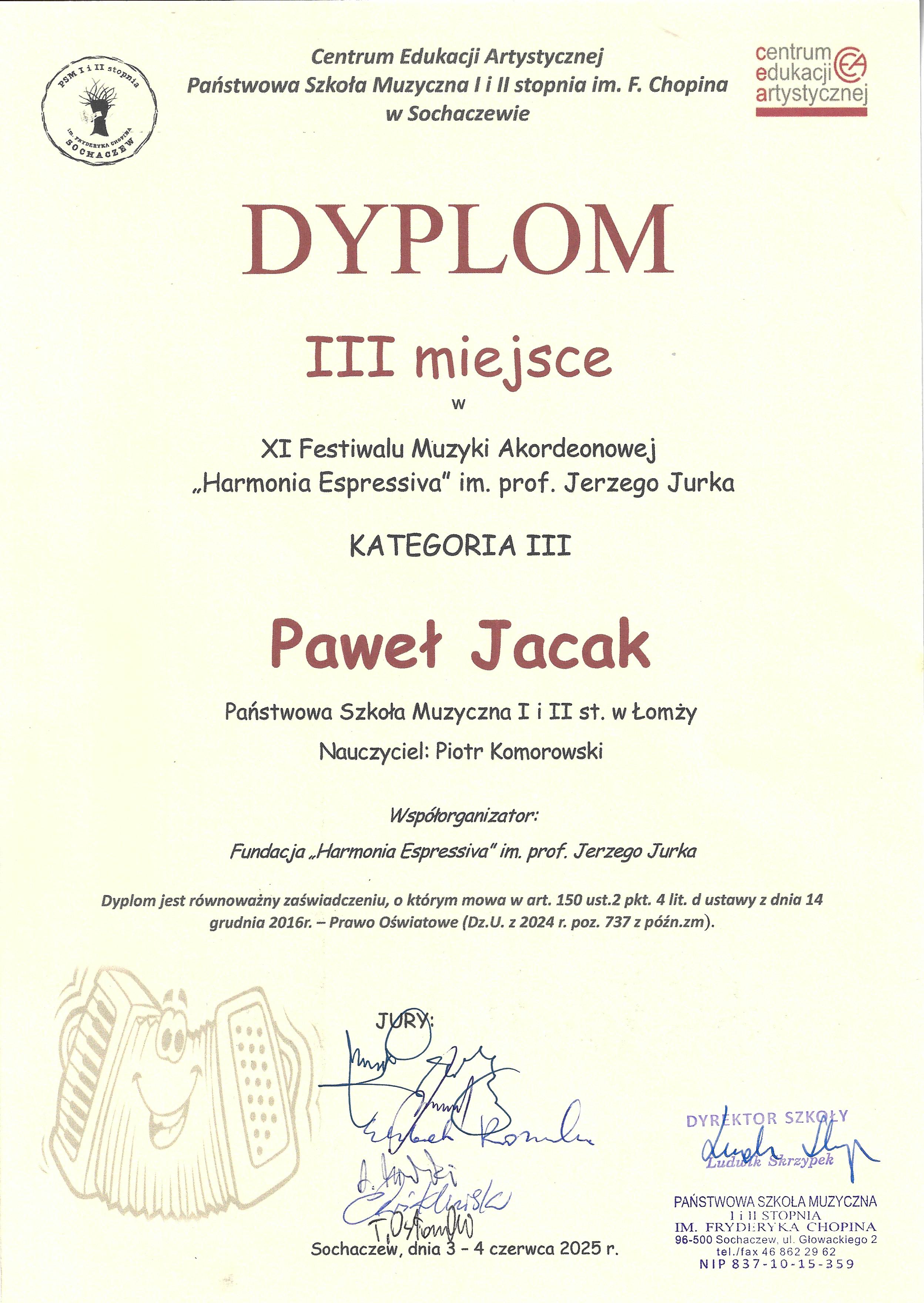 W odbywającym się w dniach 3-4 czerwca 2025 r. w Sochaczewie XI Festiwalu Muzyki Akordeonowej "Harmonia Espressiva" im. prof. Jerzego Jurka przygotowany przez Pana Piotra Komorowskiego Paweł Jacak zdobył III miejsce w III kategorii.