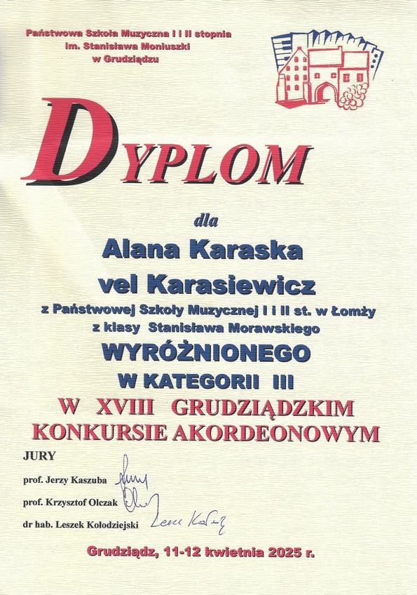 W XXIII Grudziądzkim Konkursie Akordeonowym odbywającym sie w dniach 11-12 kwietnia 2025 roku Alan Karasek vel Karasiewicz z klasy Stanisława Morawskiego uzyskał wyróżnienie.