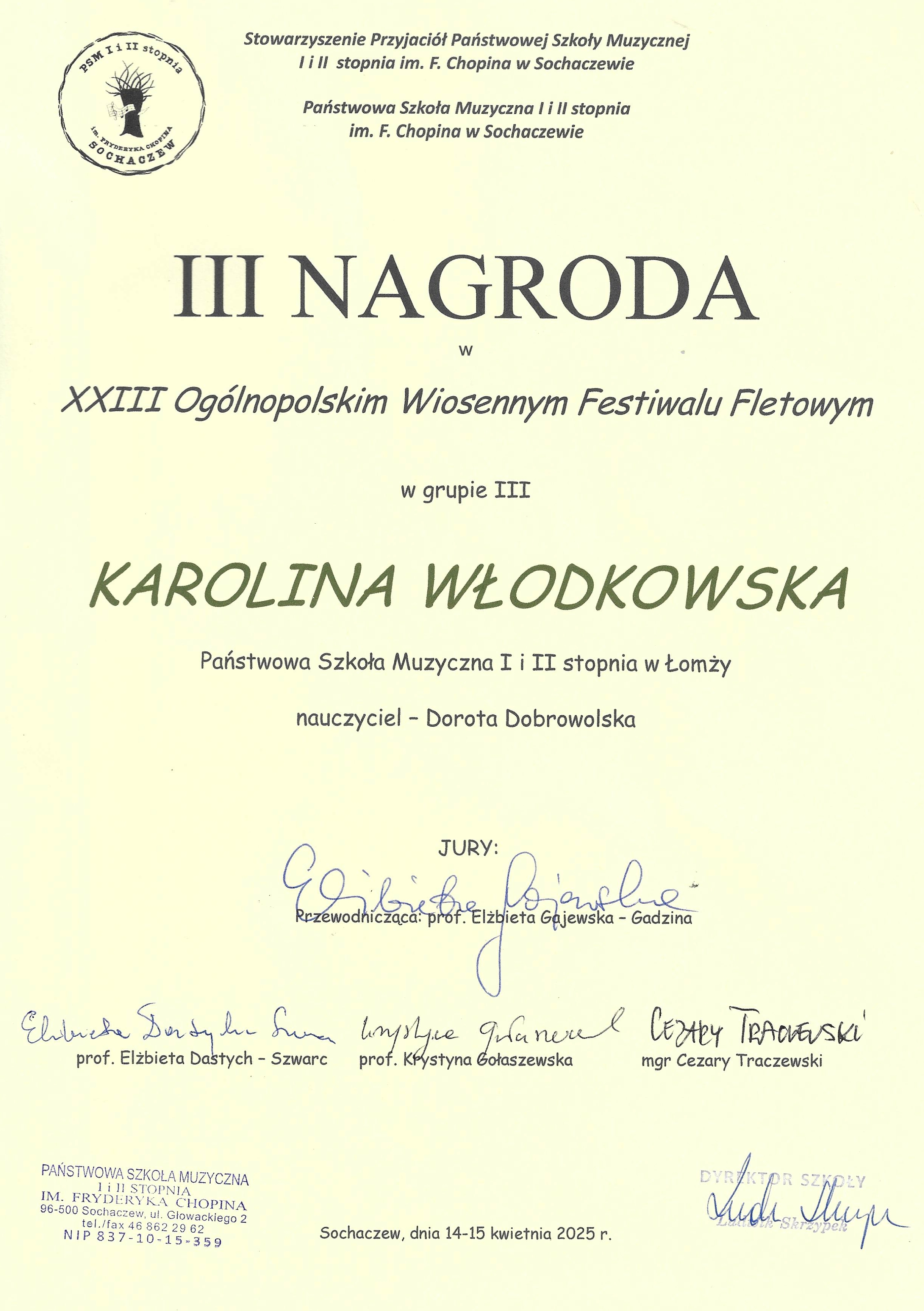 W odbywającym się w Sochaczewie XXIII Ogólnopolskim Wiosennym Festiwalu Fletowym Karolina Włodkowska z klasy Pani Doroty Dobrowolskiej zdobyła III miejsce.