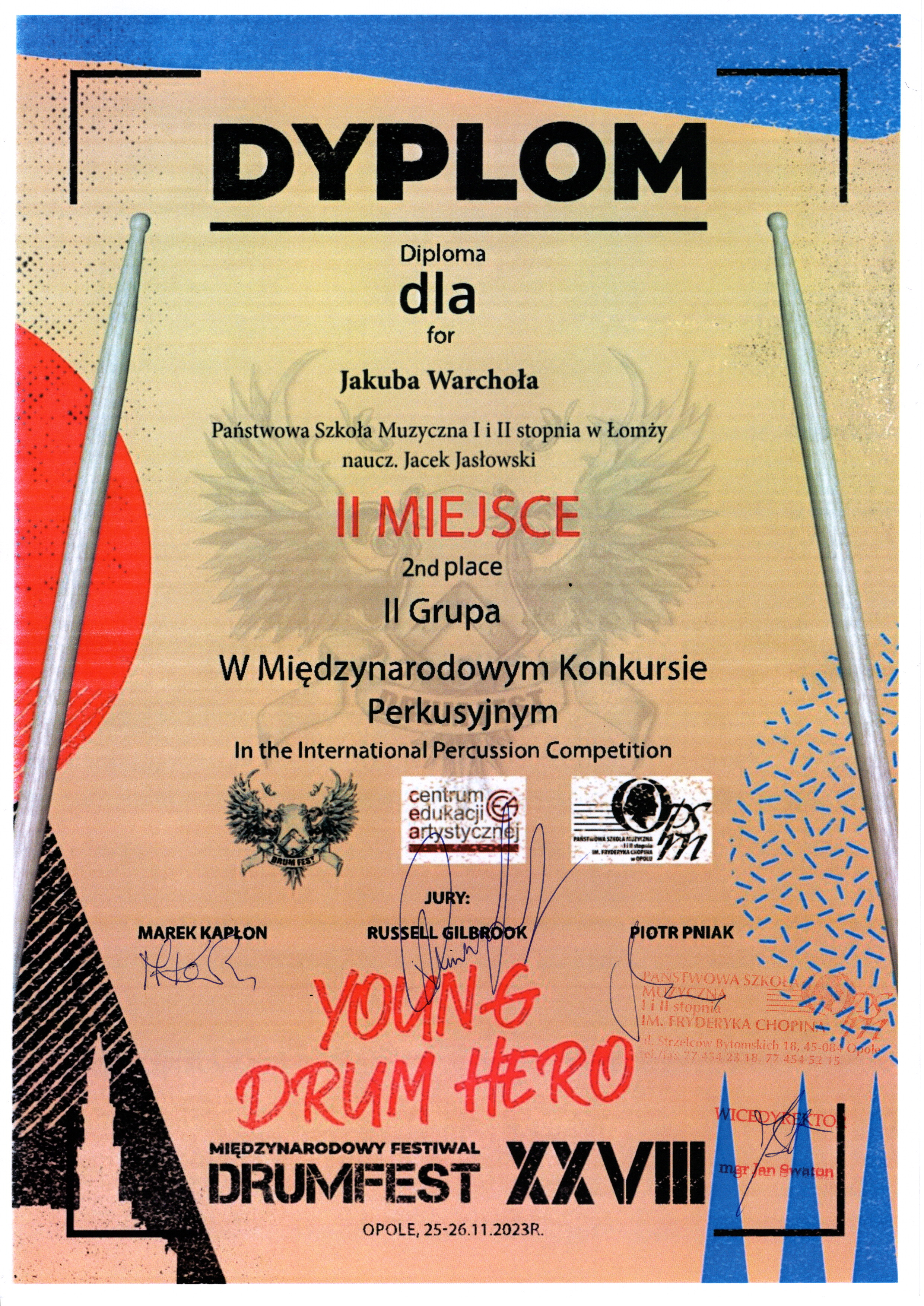 W Międzynarodowym Konkursie Perkusyjnym "Young Drum Hero" odbywającym się 25-26 listopada 2023 roku w Opolu w ramach Międzynarodowego Festiwalu "Drum Fest Festiwal" uczeń Jakub Warchoł z klasy Pana Jacka Jacłowskiego zdobył II miejsce.