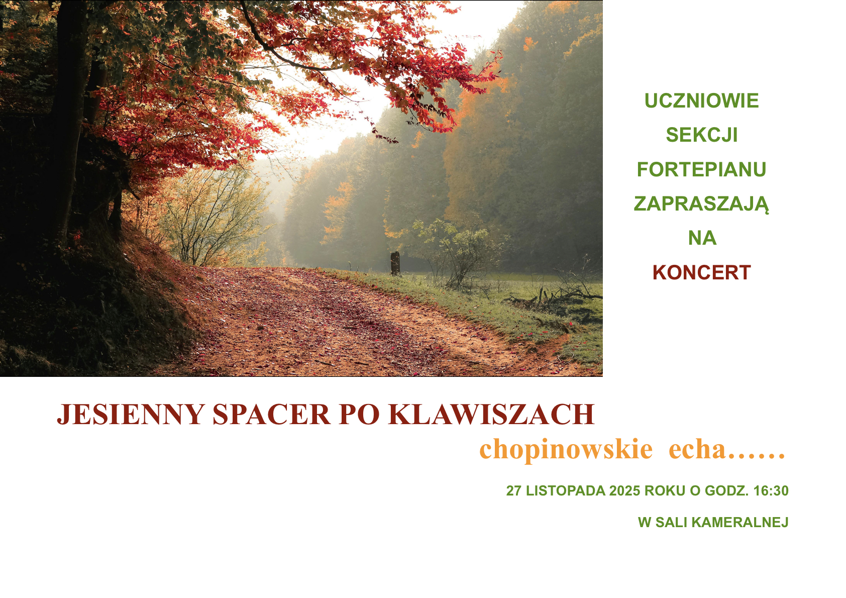 Uczniowie sekcji fortepianu zapraszają na koncert pt. „Jesienny spacer po klawiszach”, który odbędzie się 27 listopada 2025 r. o godz. 16:30 w sali kameralnej.