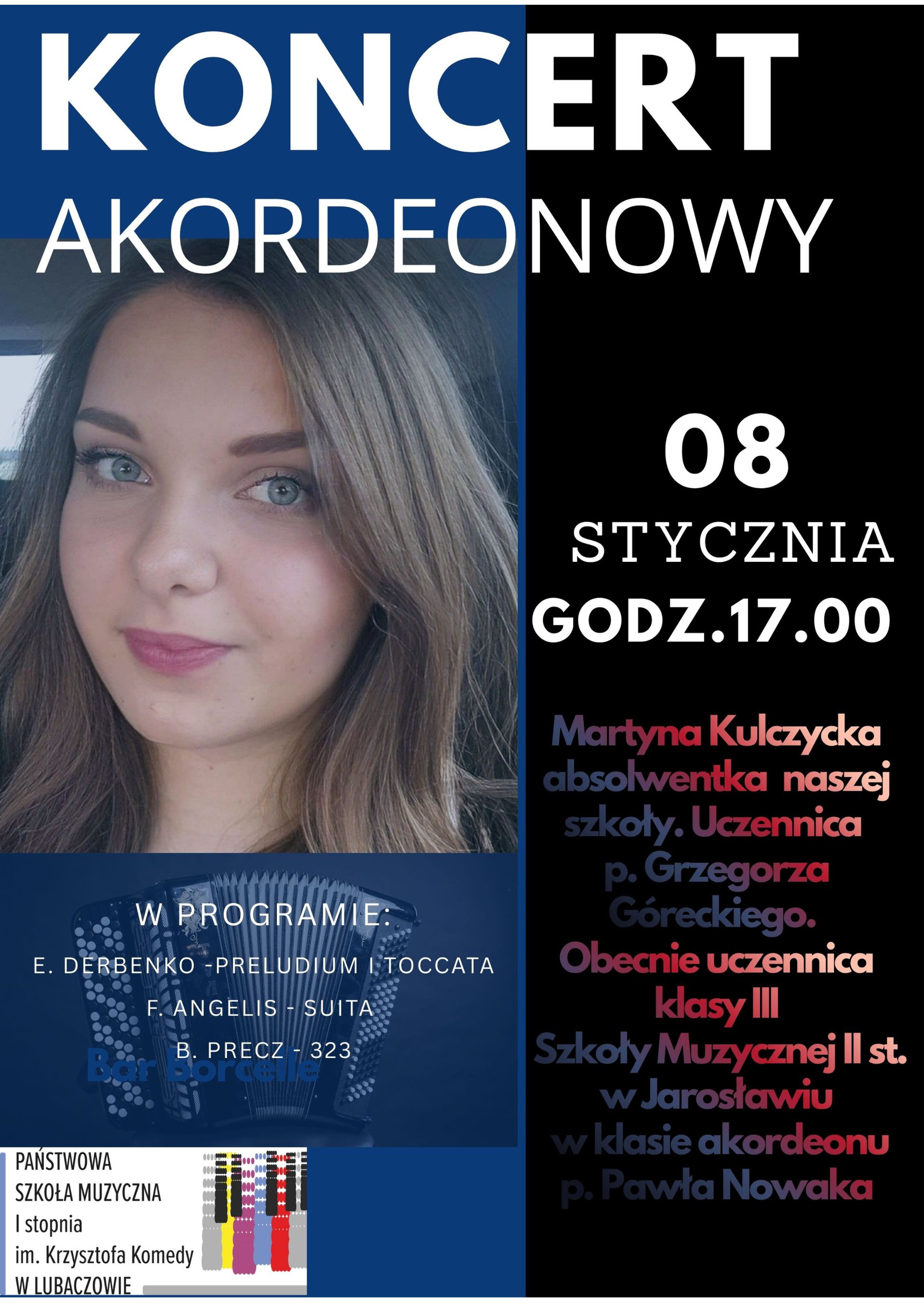 Zapraszamy na koncert akordeonowy w wykonaniu Martyny Kulczyckiej - absolwentki naszej szkoły w klasie pana Grzegorza Góreckiego, obecnie uczennica Zespołu Państwowych Szkół Muzycznych im. F. Chopina w Jarosławiu w klasie pana Pawła Nowaka. Koncert odbędzie się 8 stycznia 2026 r. o godz. 17:00 w sali koncertowej.