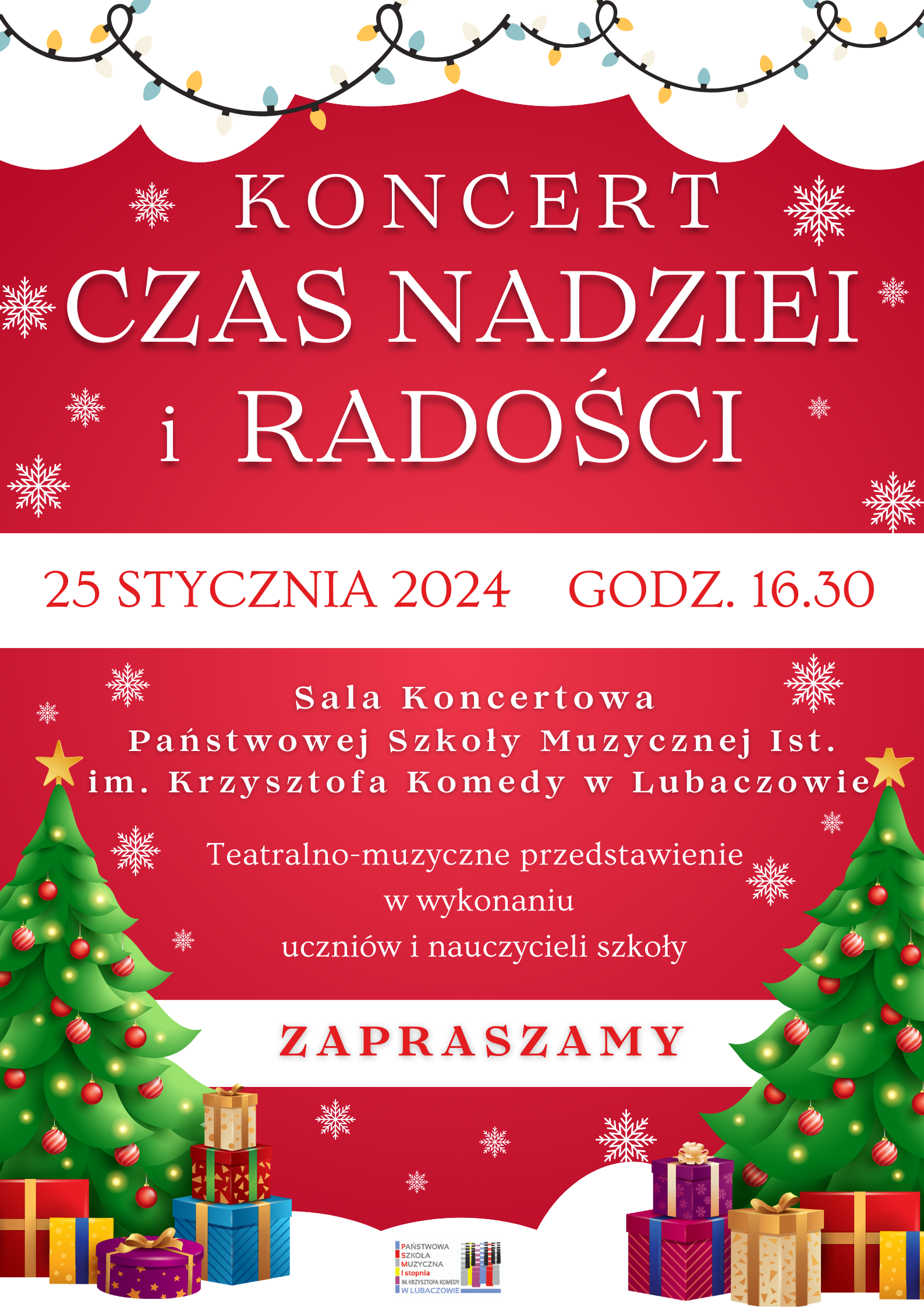 Zapraszamy na koncert pt. „Czas nadziei i radości” w wykonaniu uczniów i nauczycieli naszej szkoły, który odbędzie się 25 stycznia 2024 r. o godzinie 16:30 w sali koncertowej.