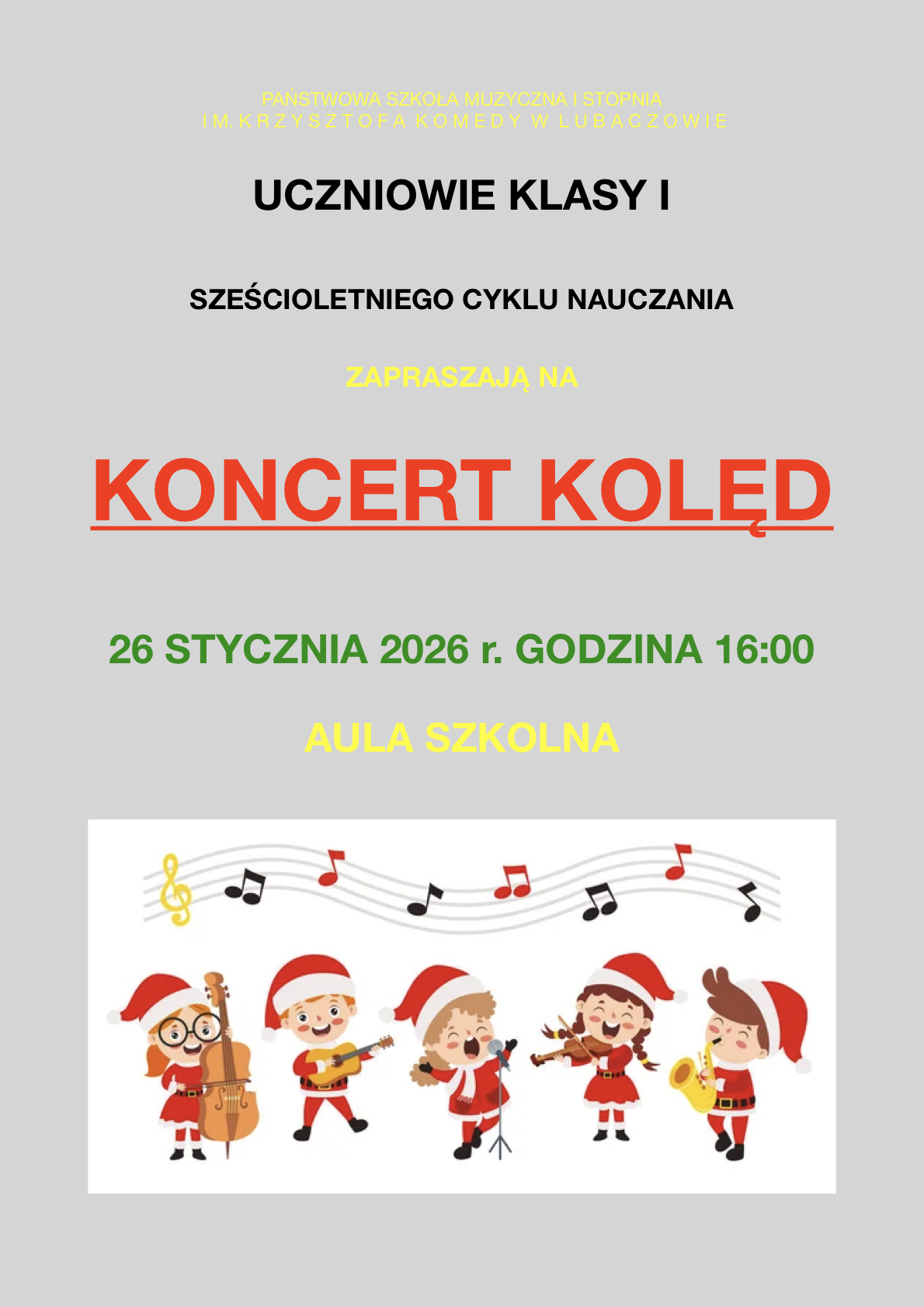 Zapraszamy na koncert kolęd klasy I cyklu sześcioletniego, który odbędzie się 26 stycznia 2026 r. o godz. 16:00 w sali kameralnej.