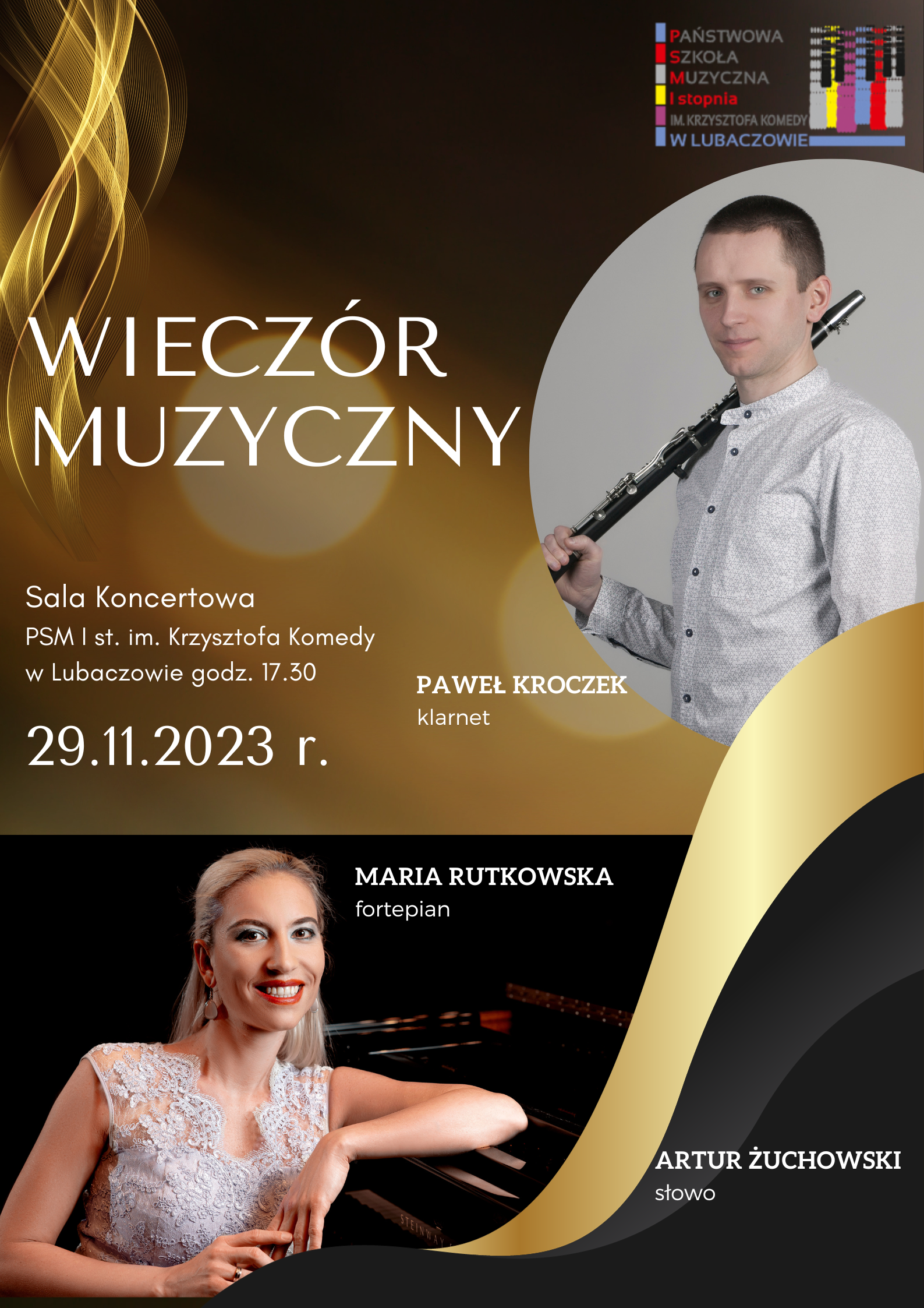 Już 29 listopada będziemy gościć w naszej szkole artystów z Akademii Muzycznej im. I. J. Paderewskiego w Poznaniu. Pianiści i klarneciści będą uczestniczyć w warsztatach pod kierunkiem dr Marii Rutkowskiej i dr Pawła Kroczka. Uczniów pozostałych specjalności zapraszamy na spotkanie z kompozytorem p. dr. Arturem Żuchowskim.
