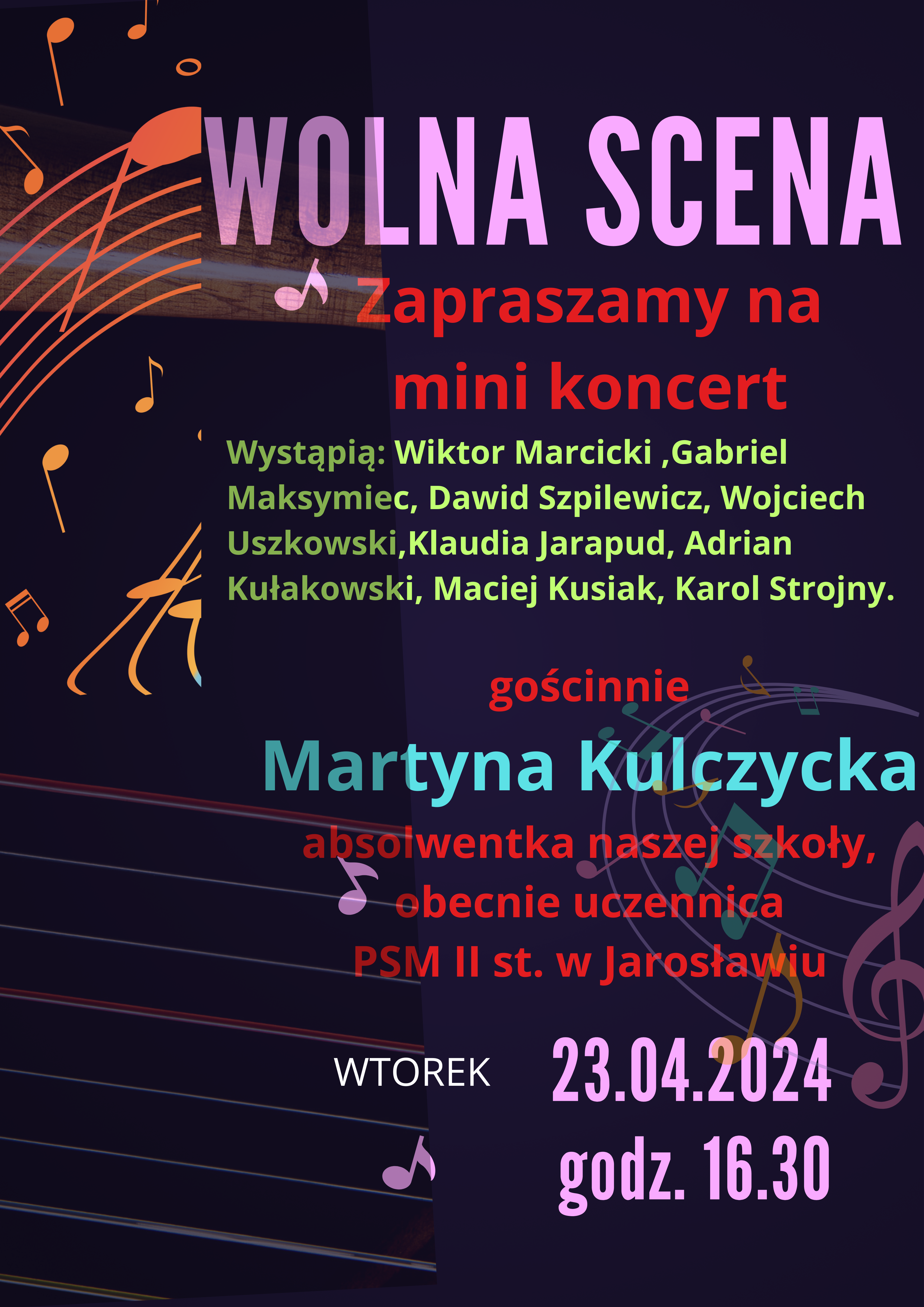 Zapraszamy na koncert w wykonaniu uczniów i absolwentów naszej szkoły, który odbędzie się 23 kwietnia 2024 r. o godzinie 16:30 w auli szkolnej.