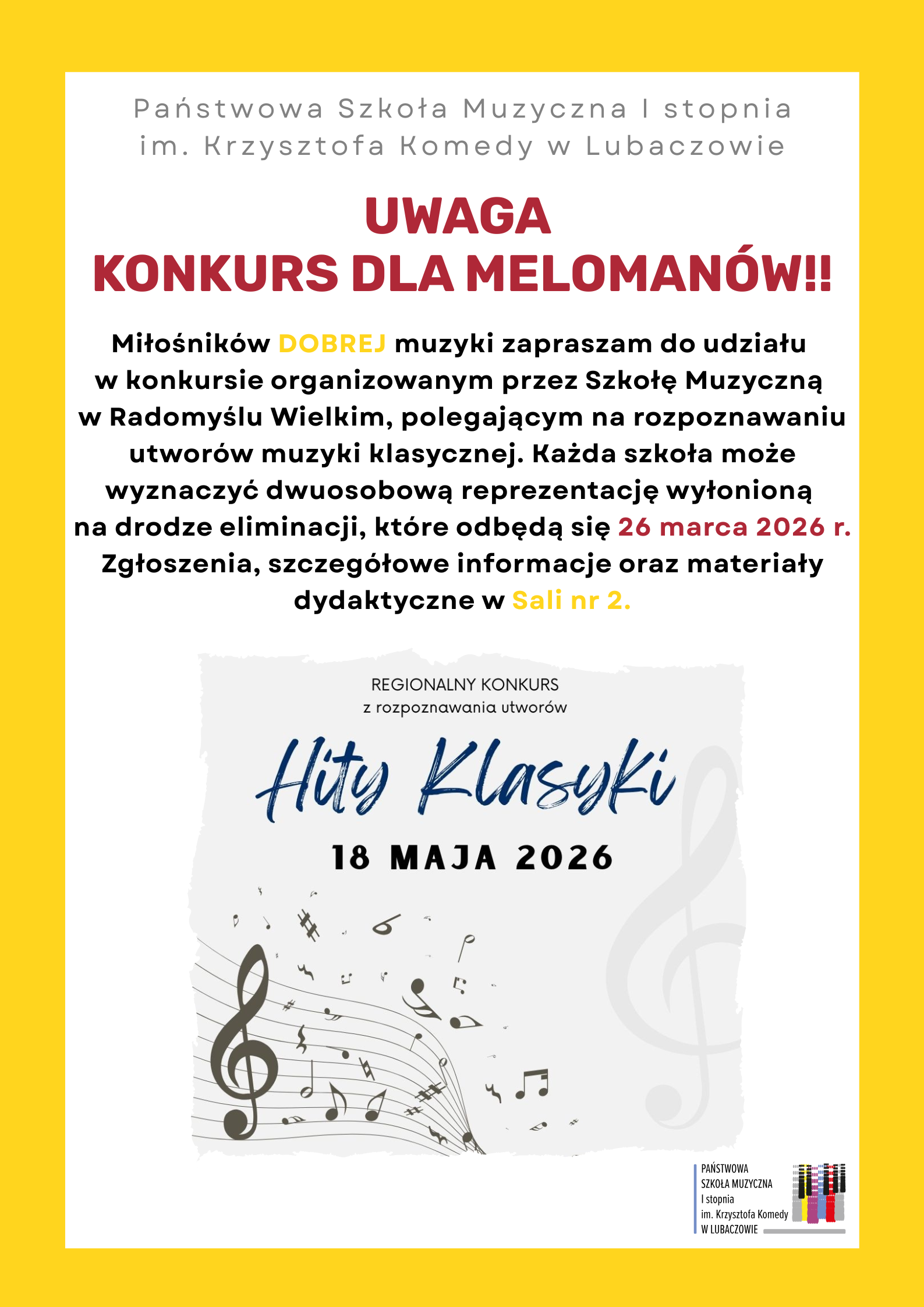 Miłośników DOBREJ muzyki zapraszam do udziału w konkursie organizowanym przez Szkołę Muzyczną w Radomyślu Wielkim, polegającym na rozpoznawaniu utworów muzyki klasycznej. Każda szkoła może wyznaczyć dwuosobową reprezentację wyłonioną na drodze eliminacji, które odbędą się 26 marca 2026 r.