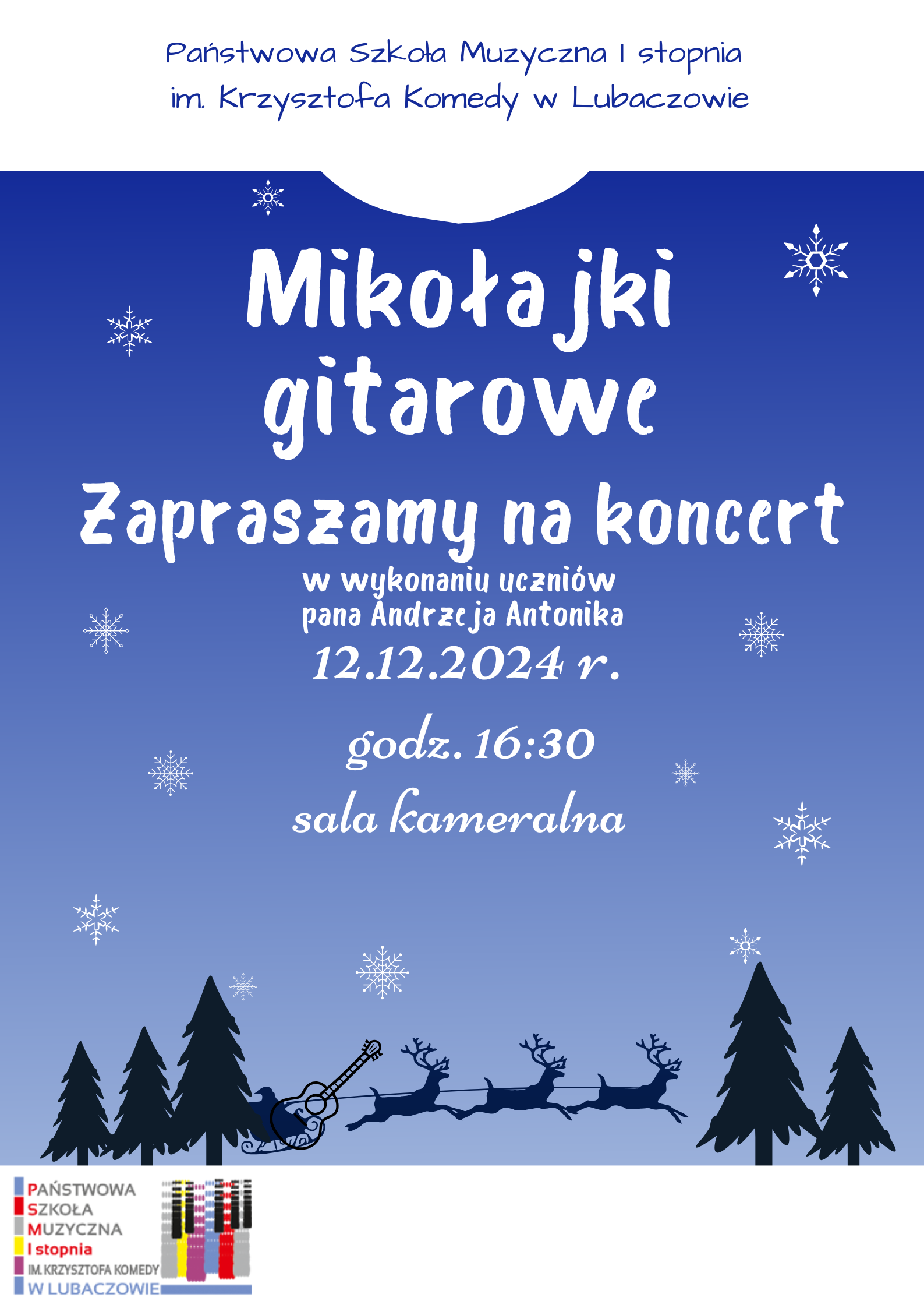 Zapraszamy na koncert w wykonaniu uczniów klasy gitary pana Andrzeja Antonika, który odbędzie się 12 grudnia 2024 r. o godzinie 16:30 w sali kameralnej.