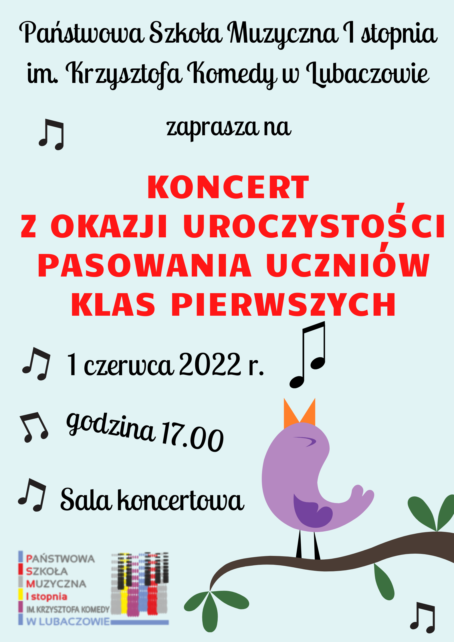Państwowa Szkoła Muzyczna I stopnia im. Krzysztofa Komedy w Lubaczowie zaprasza na kocert z okazji uroczystości pasowania uczniów klas pierwszych w dniu 1 czerwca 2022 r. o godz. 17.00 na sali koncerowej szkoły.