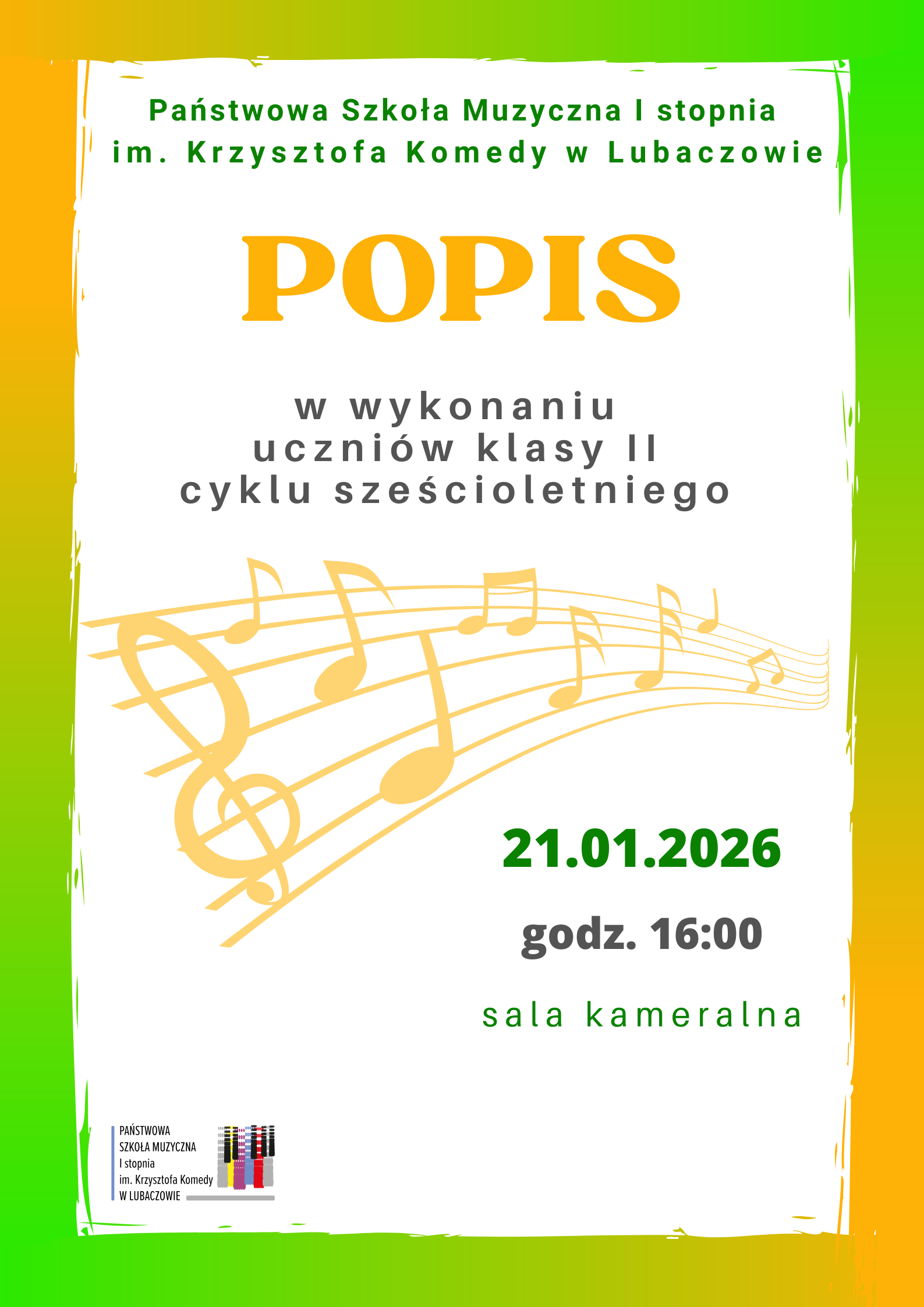 Zapraszamy na popis uczniów klasy II cyklu sześcioletniego, który odbędzie się 21 stycznia 2026 r. o godz. 16:00 w sali kameralnej.