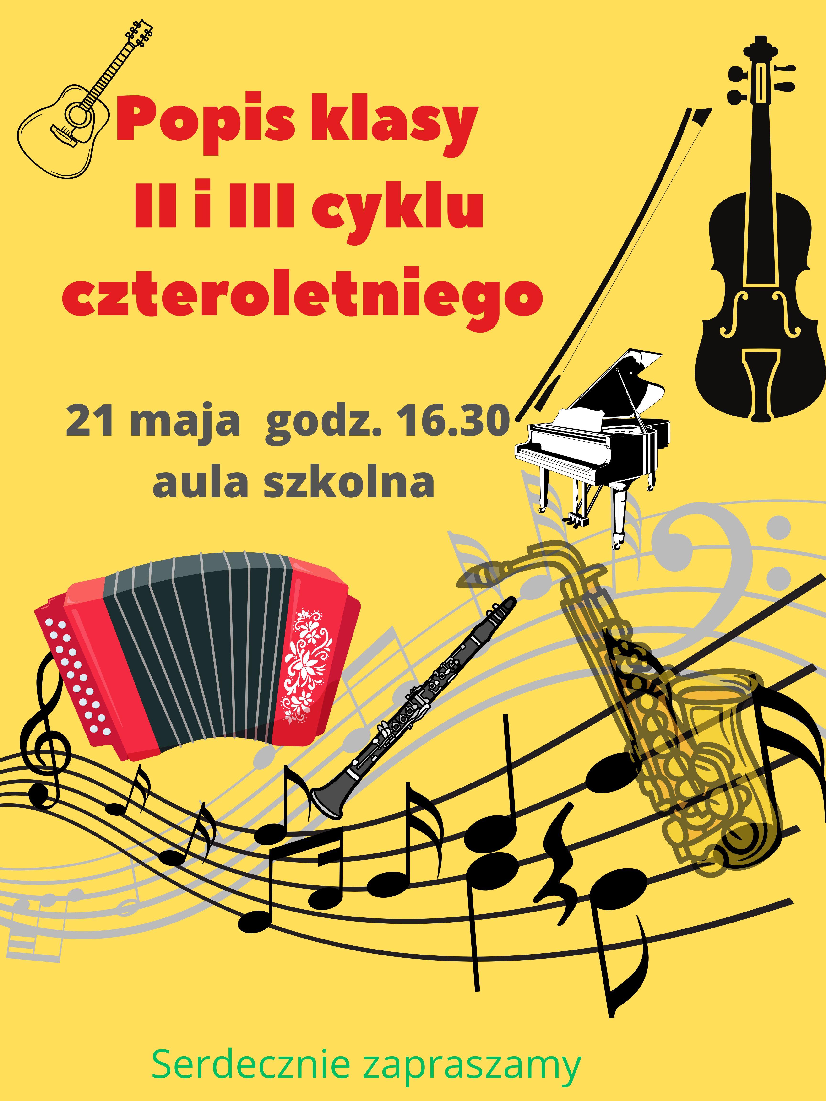 Zapraszamy na koncert w wykonaniu uczniów klasy II i III cyklu czteroletniego , który odbędzie się 21 maja 2024 r. o godzinie 16:30 w auli szkolnej.