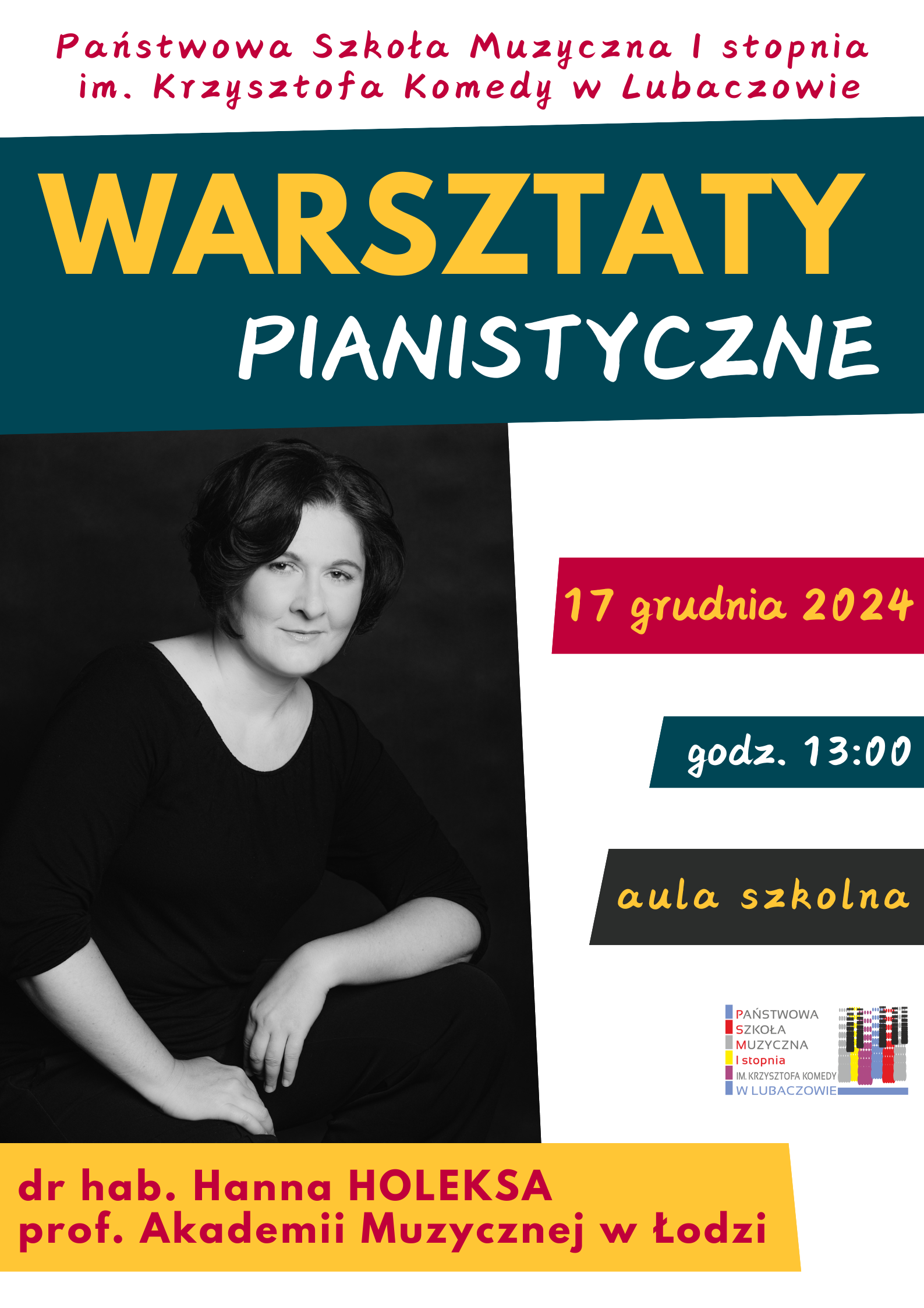 17 grudnia 2024 r. będziemy mieli zaszczyt gościć w naszej szkole dr hab. Hannę Holeksa prof. Akademii Muzycznej w Łodzi, która poprowadzi warsztaty pianistyczne. Warsztaty rozpoczną się o godz. 13:00 w auli szkolnej.