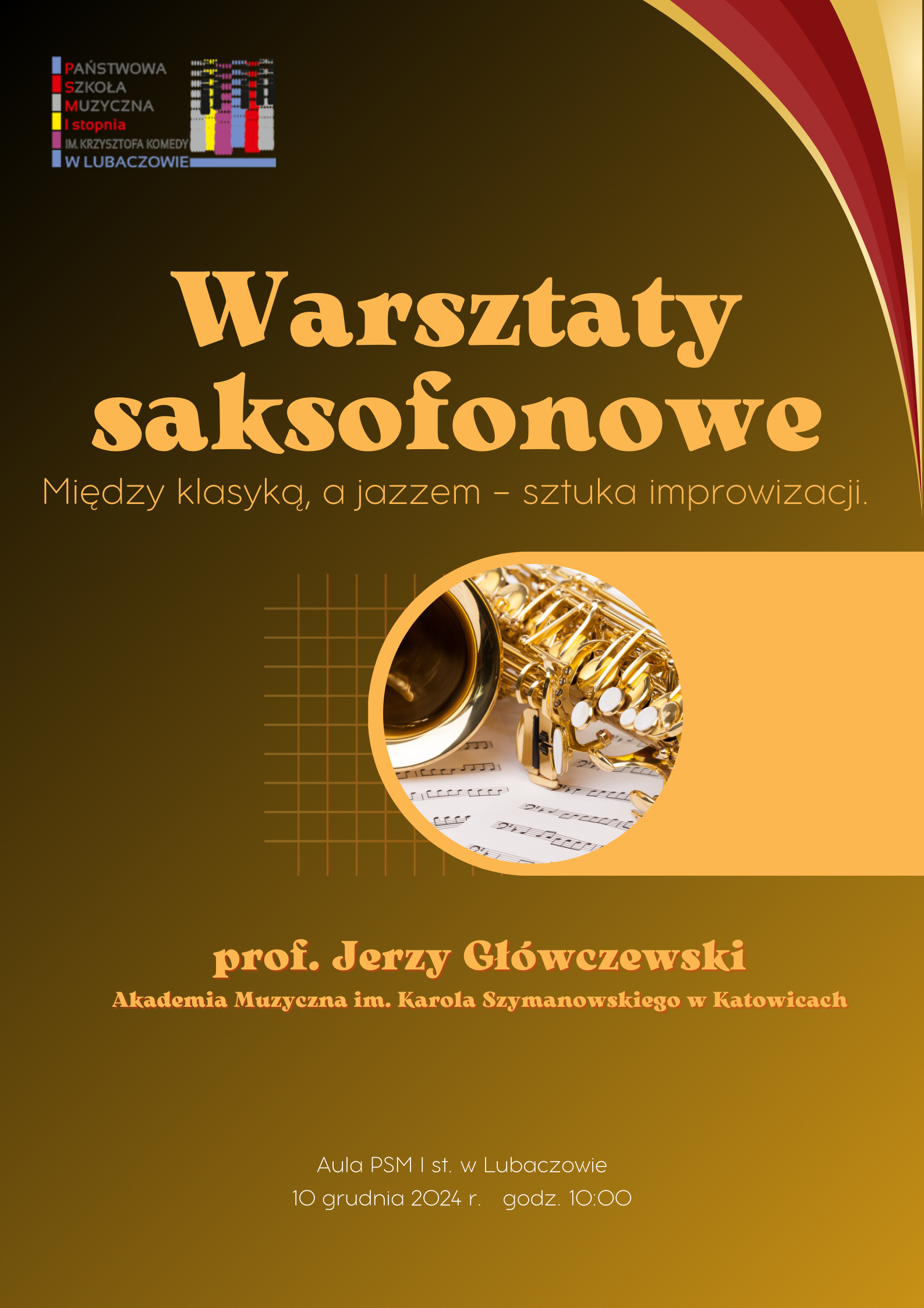 10 grudnia 2024r. o godzinie 10:00 w Sali kameralnej Państwowej Szkoły Muzycznej I st. w Lubaczowie odbędą się Warsztaty Saksofonowe prowadzone przez prof. Jerzego Główczewskiego.