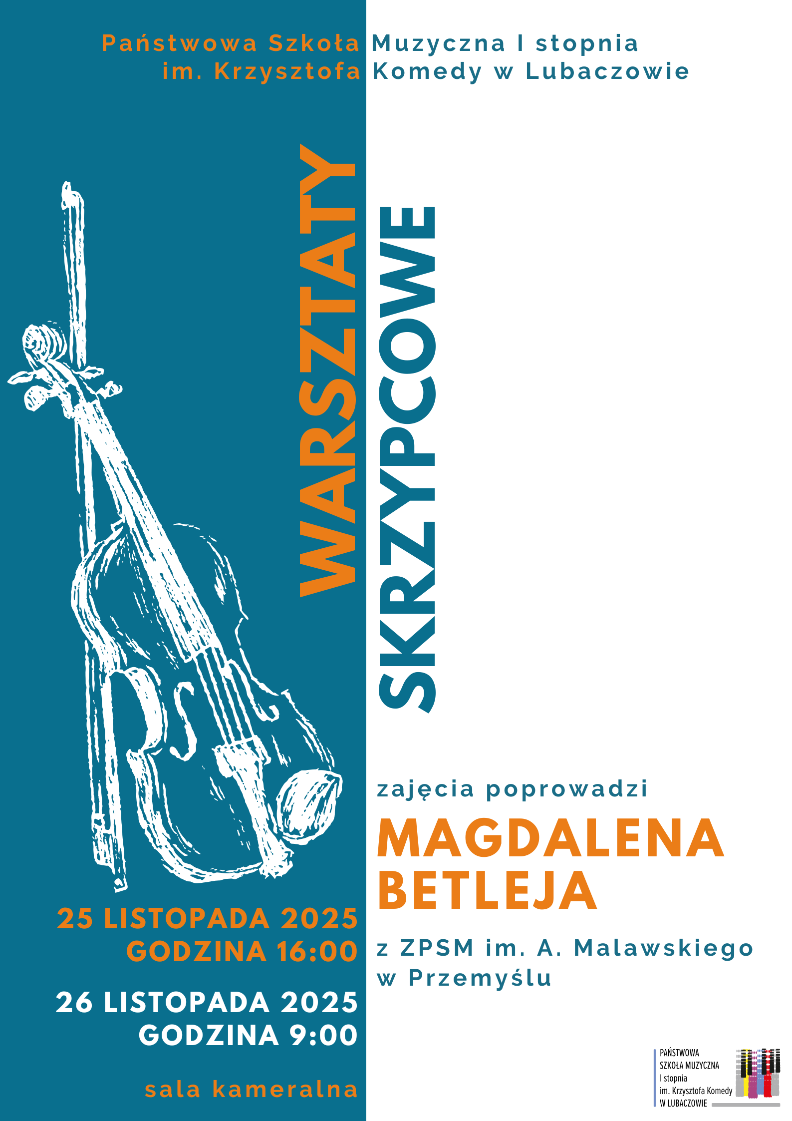 Zapraszamy na warsztaty skrzypcowe, które poprowadzi mgr Magdalena Betleja. Warsztaty rozpocznął się 25 listopada 2025 r. od godz. 16:00 oraz 26 listopada 2025 r. o godz. 9:00 w auli szkolnej.
