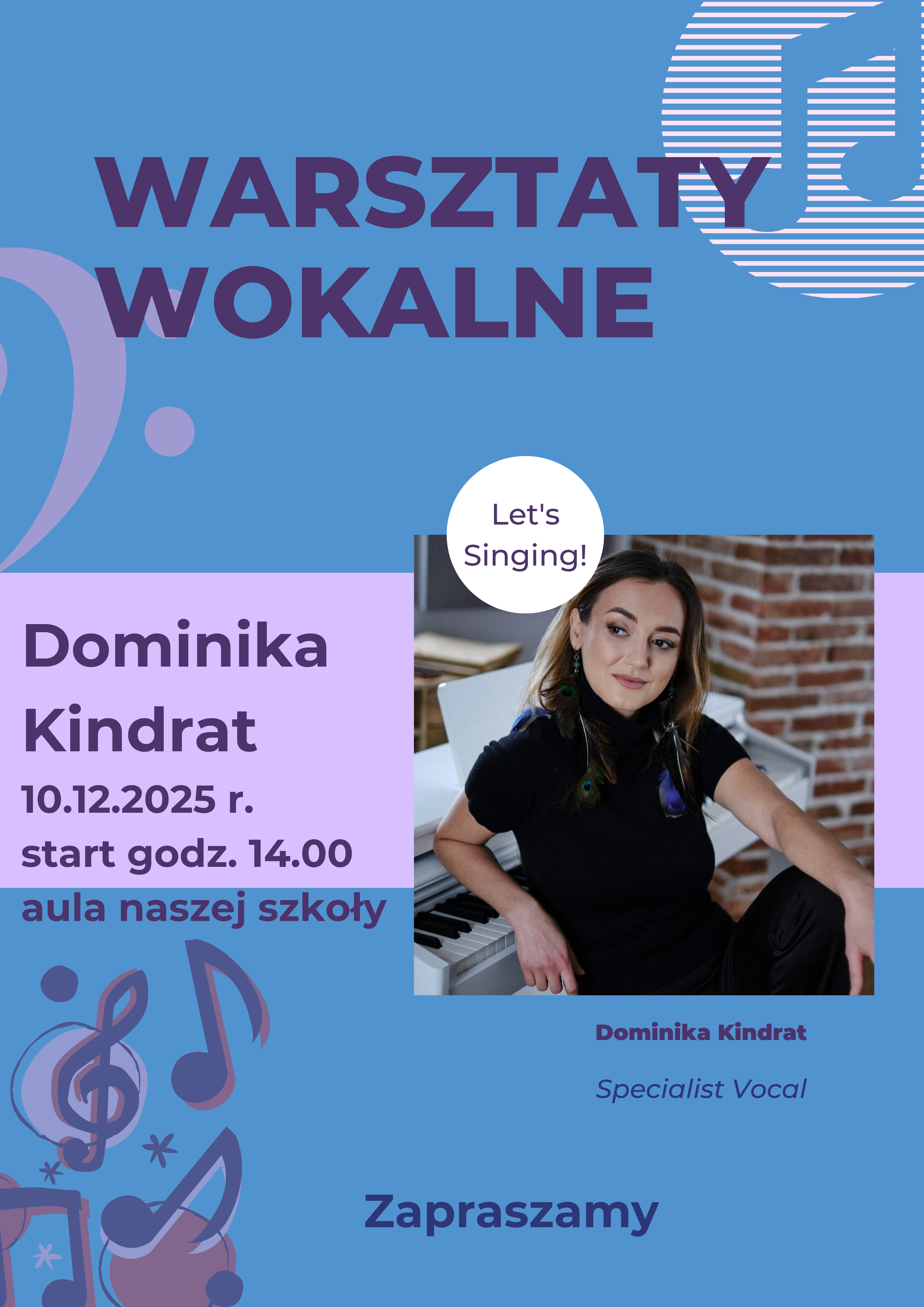 Zapraszamy na warsztaty wokalne, które poprowadzi wokalistka sesyjna, trenerka głosu, pedagog Dominika Kindrat. Warsztaty odbędą się 10 grudnia 2025 r. od godz. 14:00 w auli szkolnej.