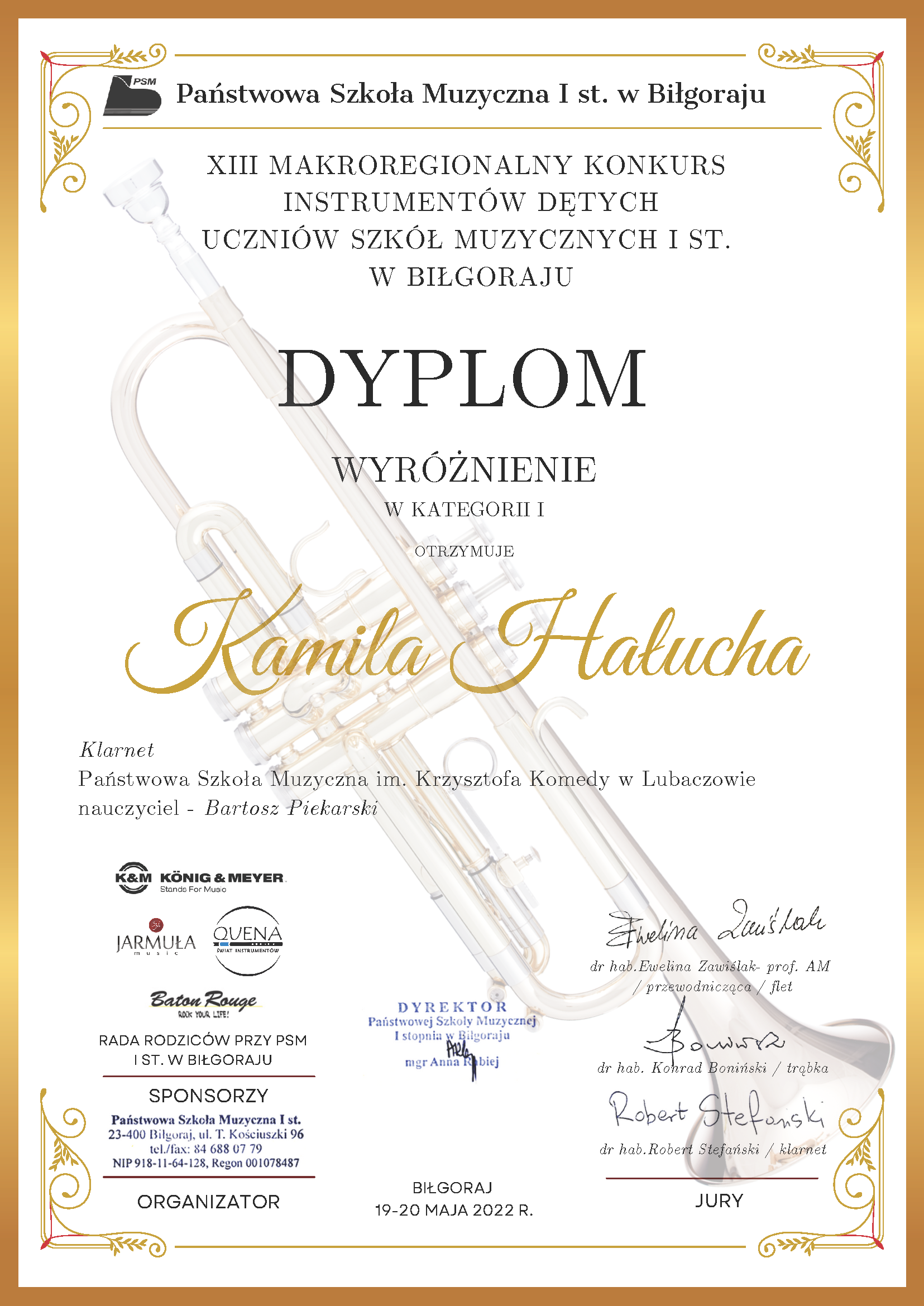 przyznało wyróżnienie w kategorii I dla Kamili Hałuchy z klasy klarnetu p. Bartosz Piekarskiego.