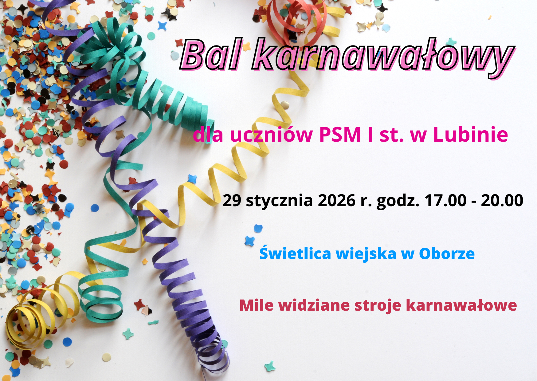 W imieniu Rady Rodziców zapraszamy wszystkich naszych uczniów na bal karnawałowy, który odbędzie 29 stycznia 2026 r. w Świetlicy wiejskiej w Oborze w godz. 17.00 - 20.00.