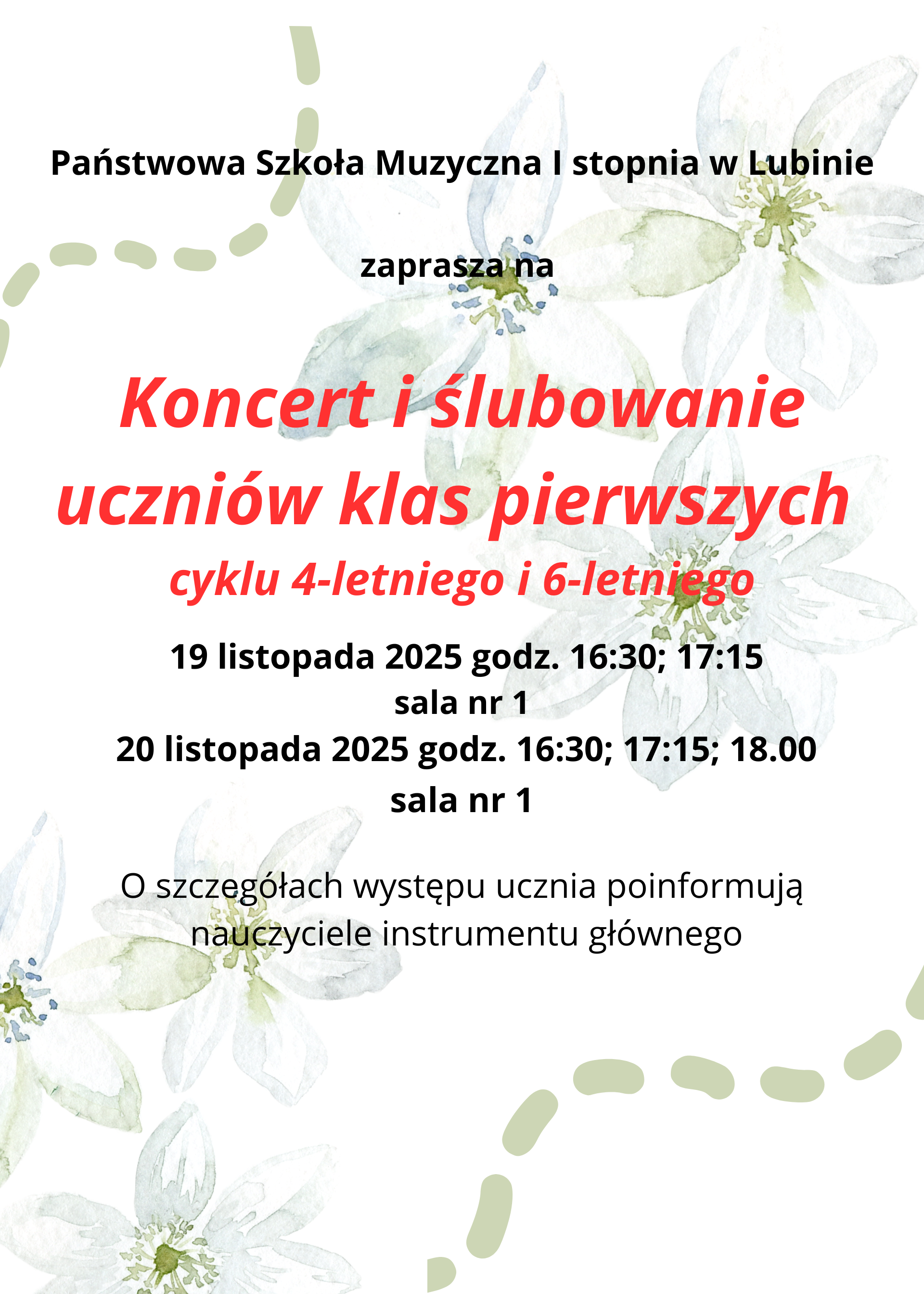 W dniach 19 - 20 listopada 2025 r. zaprezentują się nasi pierwszoklasiści . W cyklu koncertów wystąpią uczniowie cyklu 4- letniego i 6- letniego. Będzie to ich pierwszy sprawdzian na scenie przed publicznością. Tradycją szkoły jest organizacja ślubowania uczniów i uroczyste przyjęcie w poczet społeczności Państwowej Szkoły Muzycznej I stopnia. O szczegółach występów poinformują nauczyciele instrumentu głównego. Koncerty poprowadzą Anna Kret i Iwona Szymczyk - Dynak.