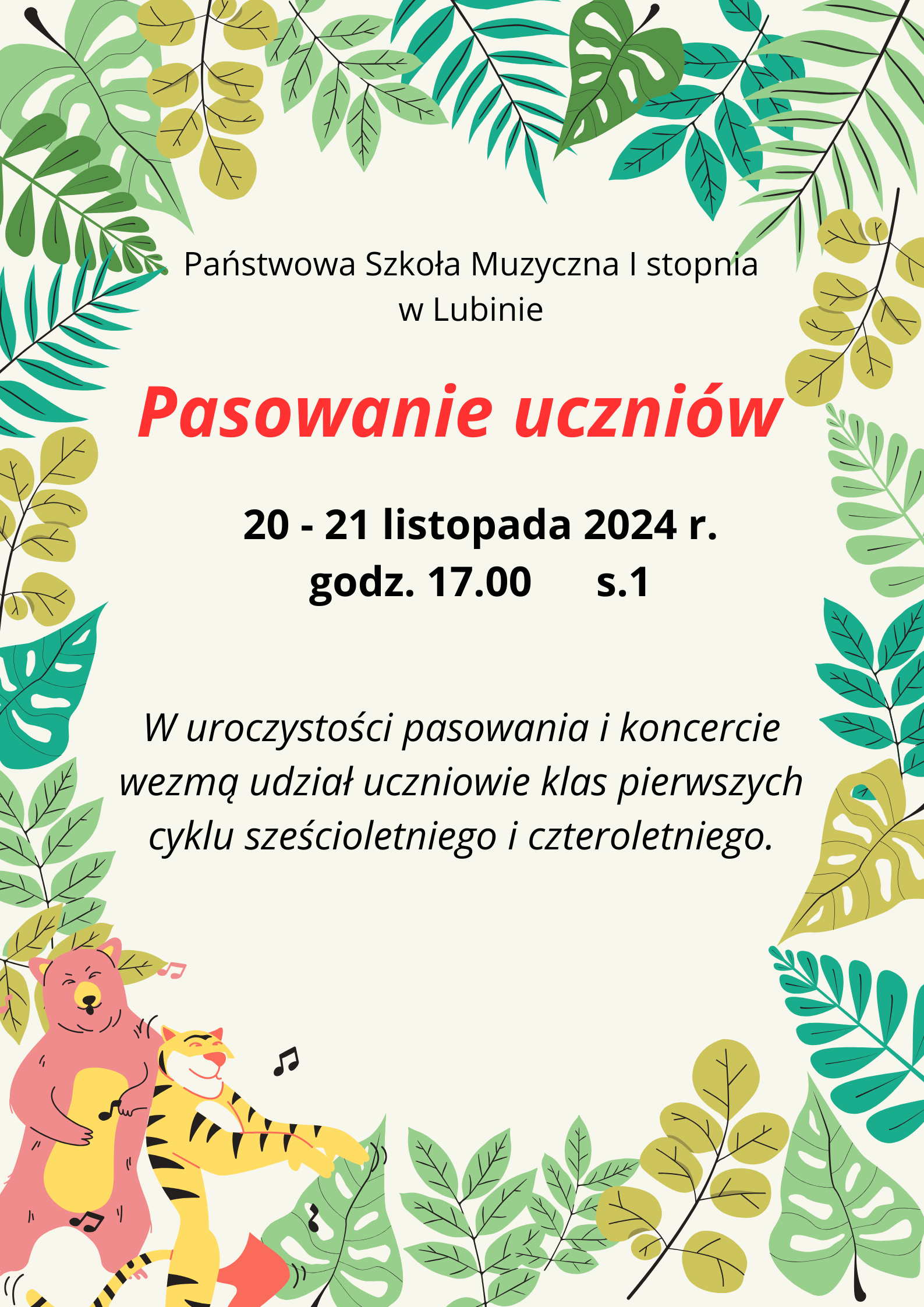 Serdecznie zapraszamy na koncert w wykonaniu tegorocznych pierwszoklasistów cyklu sześcioletniego i czteroletniego. W trakcie występu uczniowie zostaną uroczyście pasowani na członków społeczności uczniowskiej Państwowej Szkoły Muzycznej I stopnia w Lubinie. Życzymy wszystkim udanych występów.