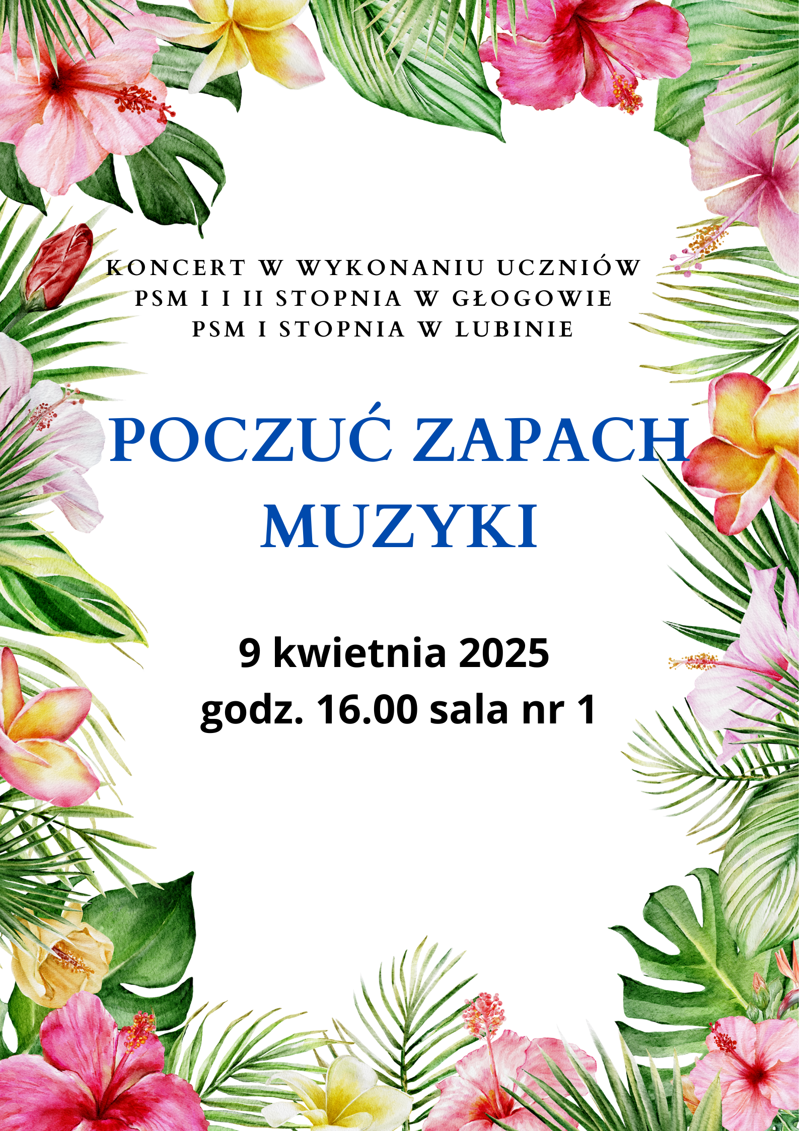 Serdecznie zapraszamy na kolejne wspólne spotkanie muzyczne uczniów Państwowej Szkoły Muzycznej I i II stopnia im. F.Liszta w Głogowie i Państwowej Szkoły Muzycznej I stopnia w Lubinie. Koncert "Poczuć zapach muzyki" wpisał się w tradycję wiosennych spotkań uczniów obu szkół. Prezentacji będzie można posłuchać 9 kwietnia 2025 r. o godz. 16.00 w sali nr 1.