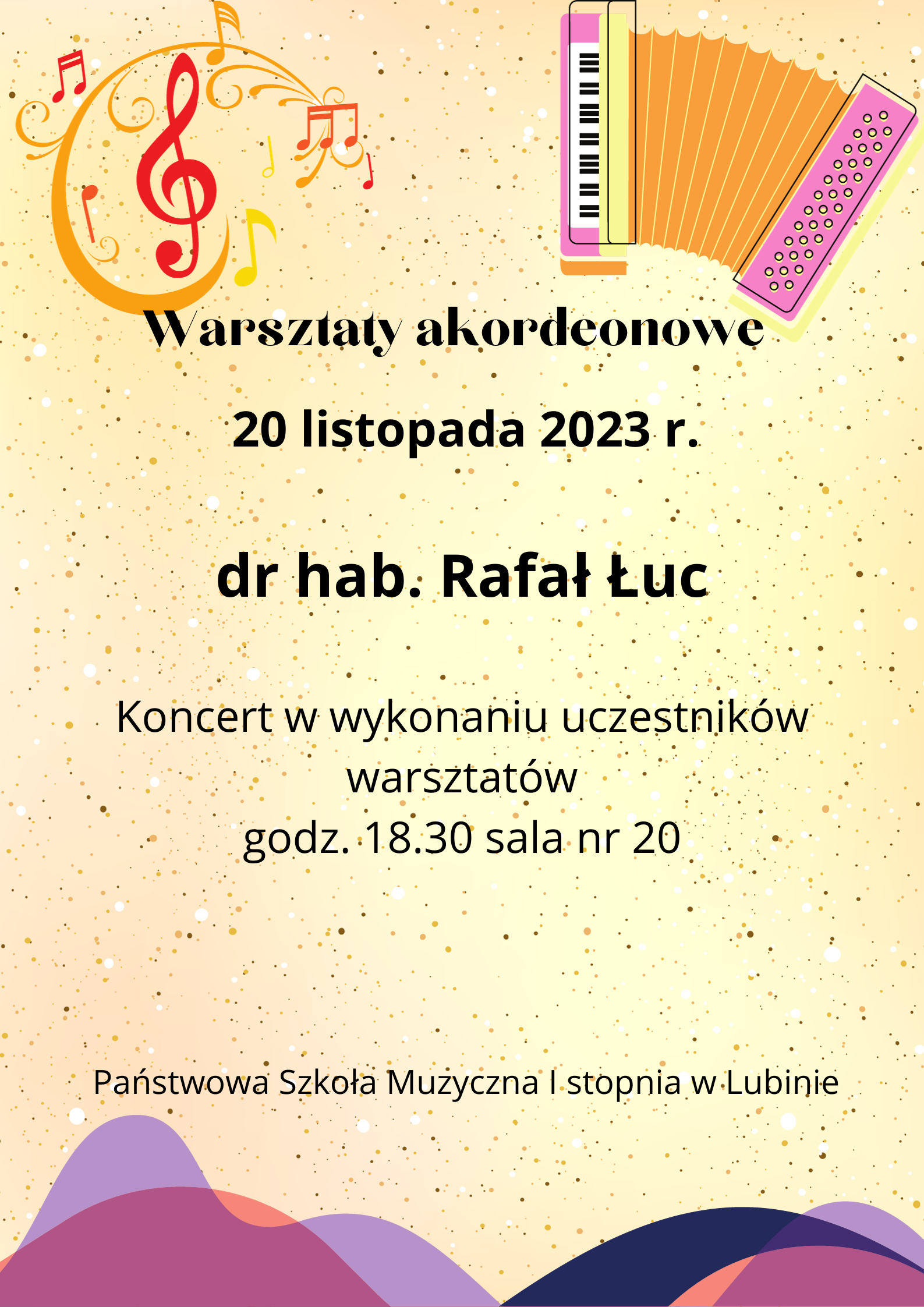 W dniu 20 listopada 2023 r. odbęda się warsztaty akordeonowe, które poprowadzi dr hab. Rafał Łuc absolwent Royal Academy of Music w Londynie (w klasie prof. Owena Murray’a), Musikene Centro Superior de Musica del Pais Vasco w San Sebastian (w klasie Iñakiego Alberdiego) oraz Akademii Muzycznej im. Karola Lipińskiego (w klasie akordeonu dr hab. Zbigniewa Łuca), w której obecnie pracuje na stanowisku adiunkta. O godz. 18.30 planowany jest koncert uczestników warsztatów oraz Pana Rafała Łuca. Serdecznie zapraszamy.