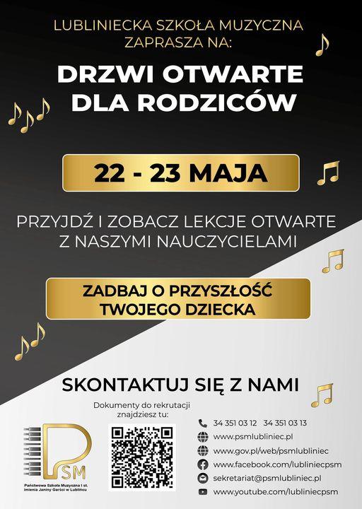 Lubliniecka Szkoła Muzyczna zaprasza na: "Drzwi otwarte dla rodziców" w dniach 22-23 maja 2024 r.