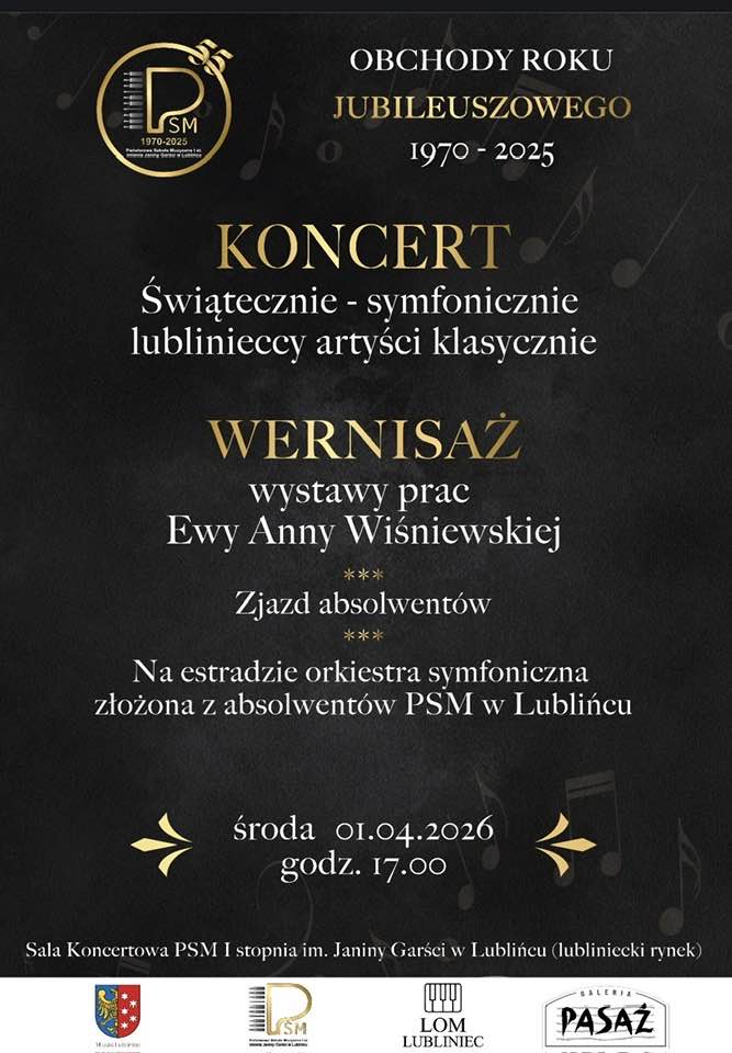 Zapraszamy na koncert w ramach obchodów roku jubileuszowego PSM I st. w Lublińcu, który odbędzie sie 1 kwietnia 2026 r. o godz. 17.00 w sali koncertowej. Wystąpią abslowenci i przyjaciele lublinieckiej szkoły.