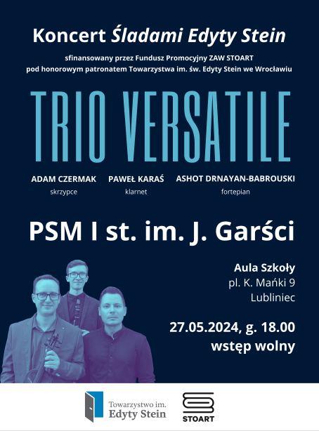 Serdecznie zapraszamy na koncert " Trio Versatile" w poniedziałek 27 maja 2024r. o godzinie 18.00 do sali koncertowej lublinieckiej szkoły muzycznej.