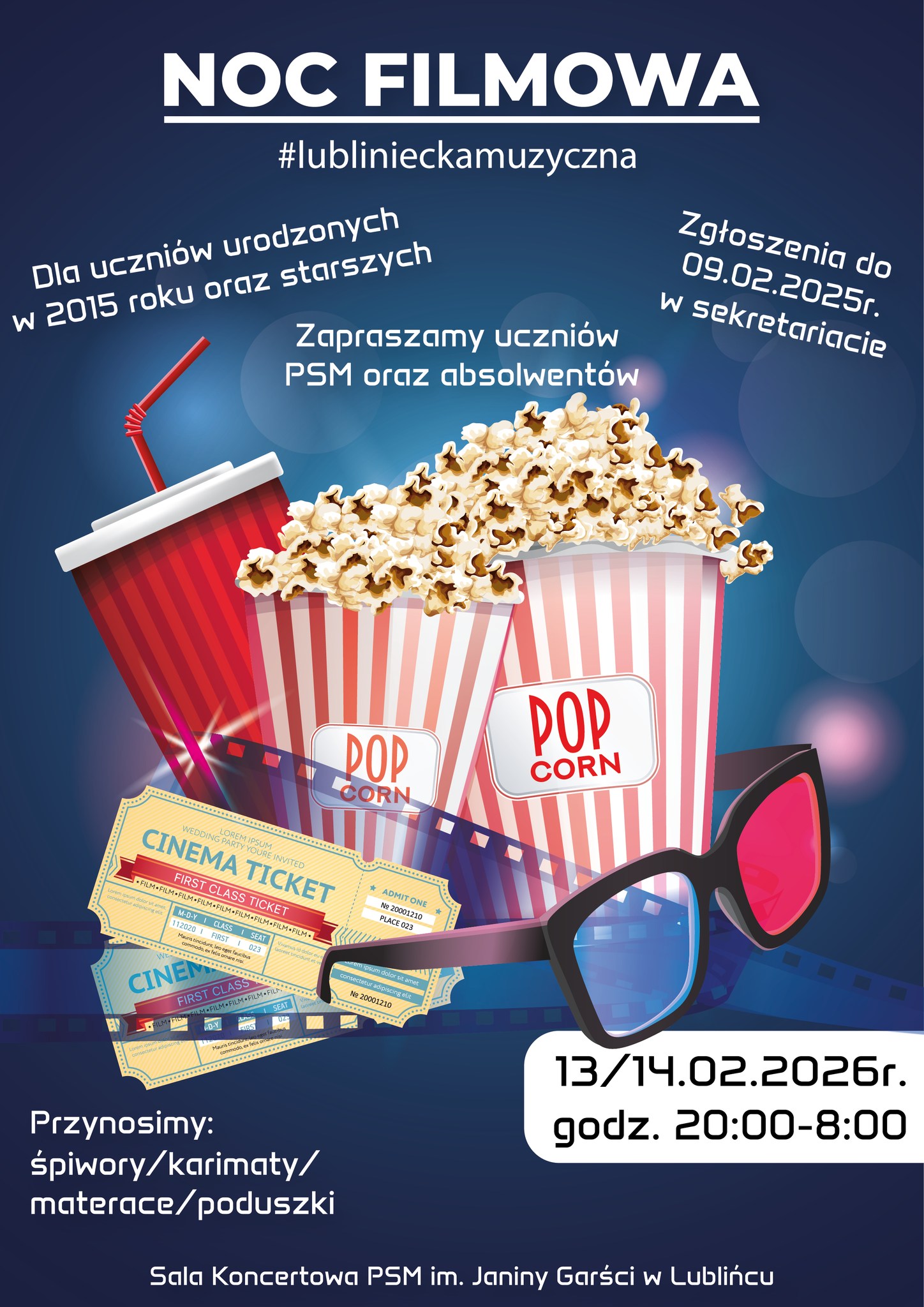 13 lutego o godz. 20:00 do 8:00. zapraszamy uczniów PSM Lubliniec (urodzonych w 2015 i starszych) oraz absolwentów naszej szkoły na NOC FILMOWĄ.