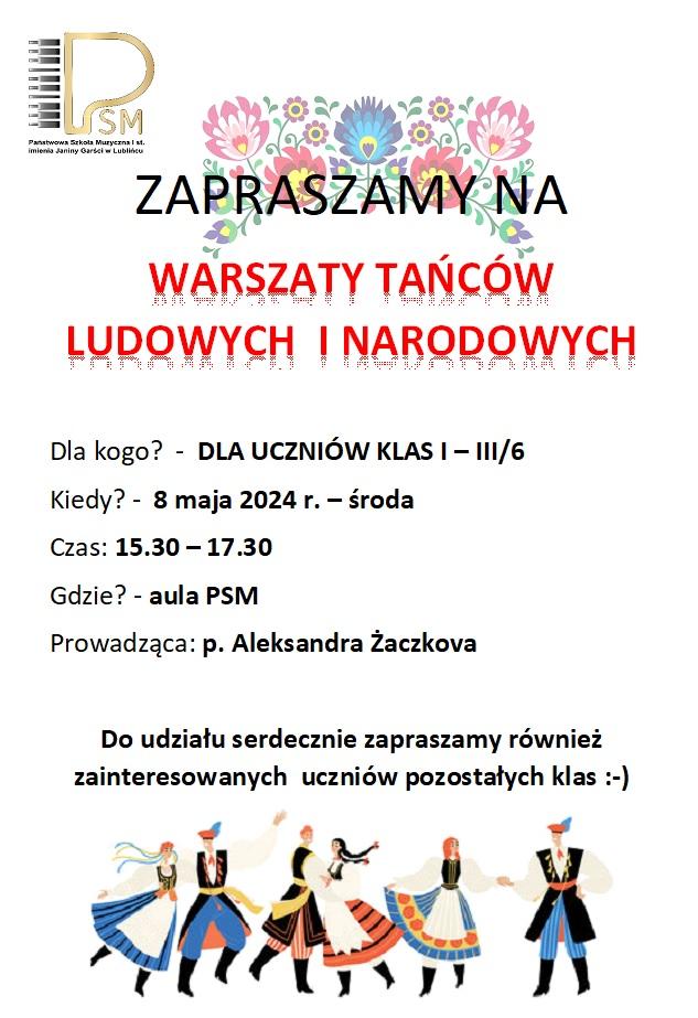 W dniu 8 maja 2024 r. zapraszamy na warsztaty tańców ludowych i narodowych dla uczniów klas I-III cyklu 6-letniego, które poprowadzi Pani Aleksandra Żaczkova. Do udziału serdecznie zapraszamy również zainteresowanych uczniów pozostałych klas.