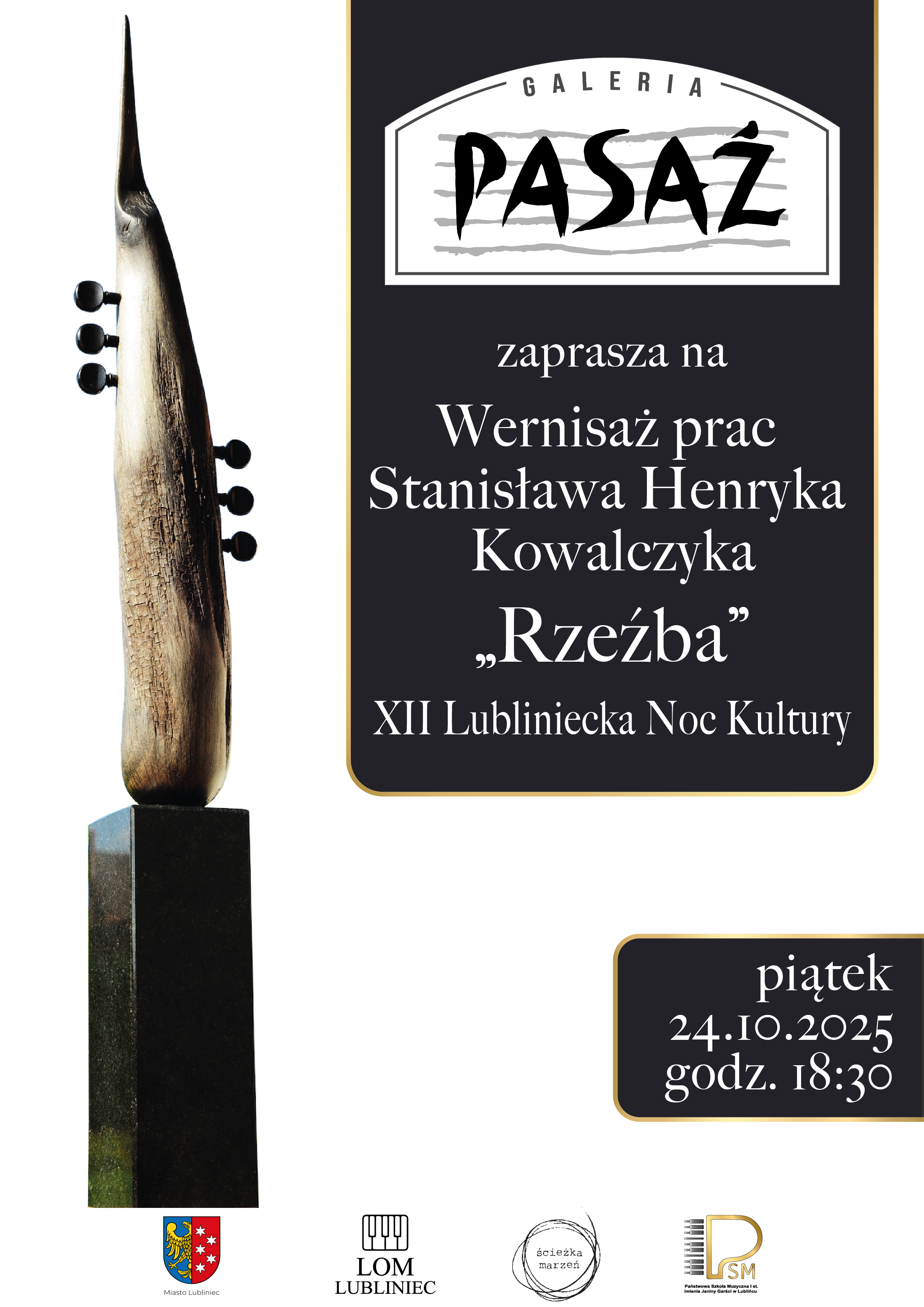 Wernisaż prac Stanisława Henryka Kowalczyka "Rzeźba" 24.10.2025 godzina 18.30 Galeria Pasaż Państwowej Szkoły Muzycznej I stopnia w Lublińcu Zapraszamy ! Wstęp wolny