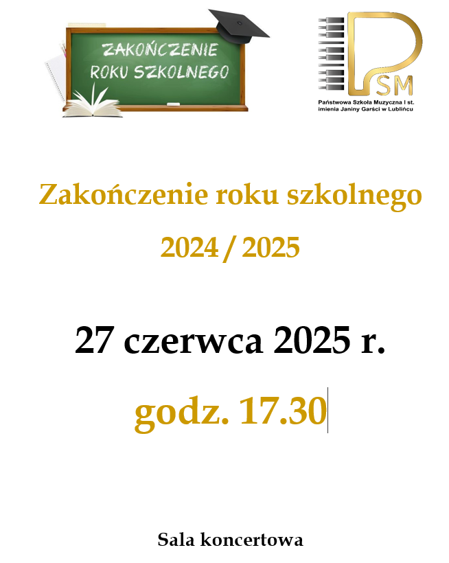 Zakończenie roku szkolnego 2024/2025 odbędzie się 27 czerwca 2025 r. o godzinie 17.30 w sali koncertowej szkoły.
