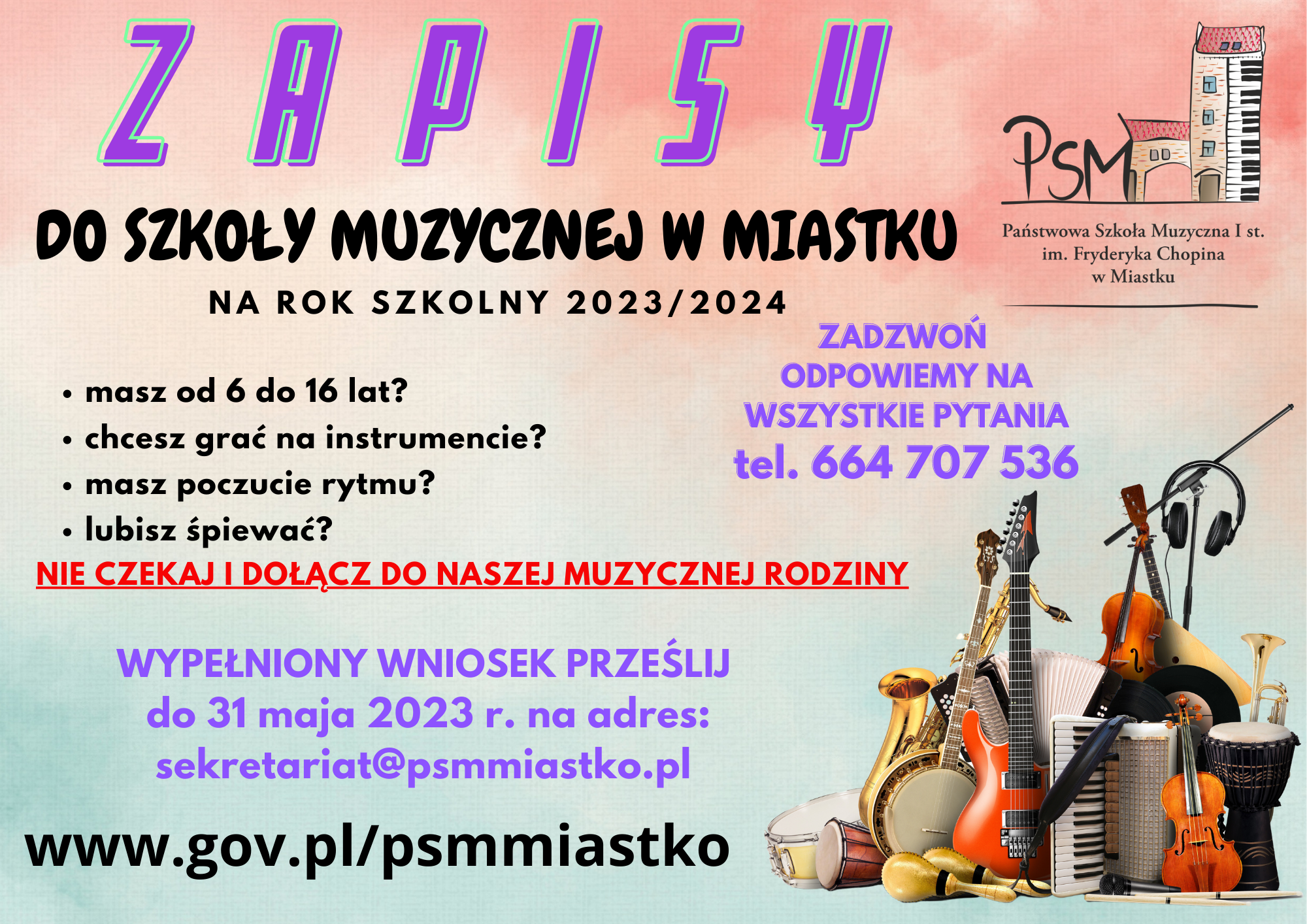 Państwowa Szkoła Muzyczna I stopnia im. Fryderyka Chopina w Miastku przeprowadza co roku rekrutację kandydatów do klas pierwszych.