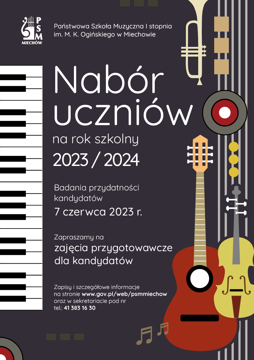 Komunikat w sprawie REKRUTACJI do Państwowej Szkoły Muzycznej I stopnia im. Michała Kleofasa Ogińskiego w Miechowie na rok szkolny 2023/24